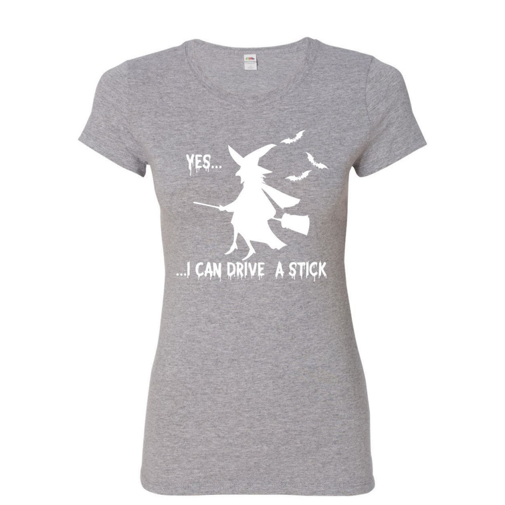 YES, I CAN DRIVE A STICK cotton t-shirt funny halloween witch gray