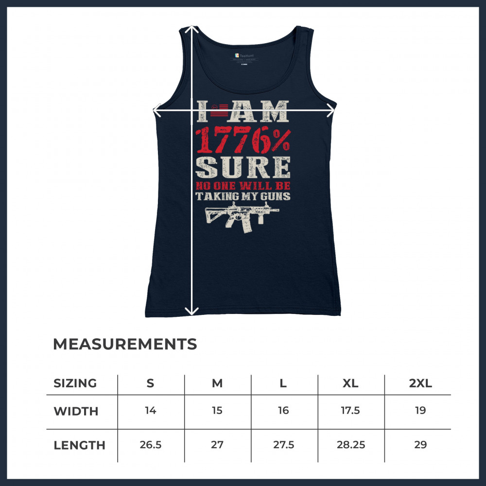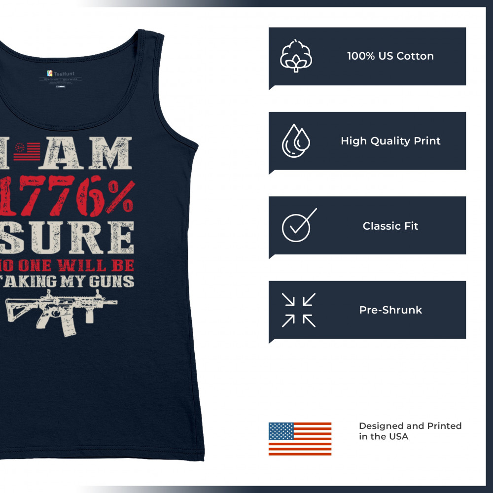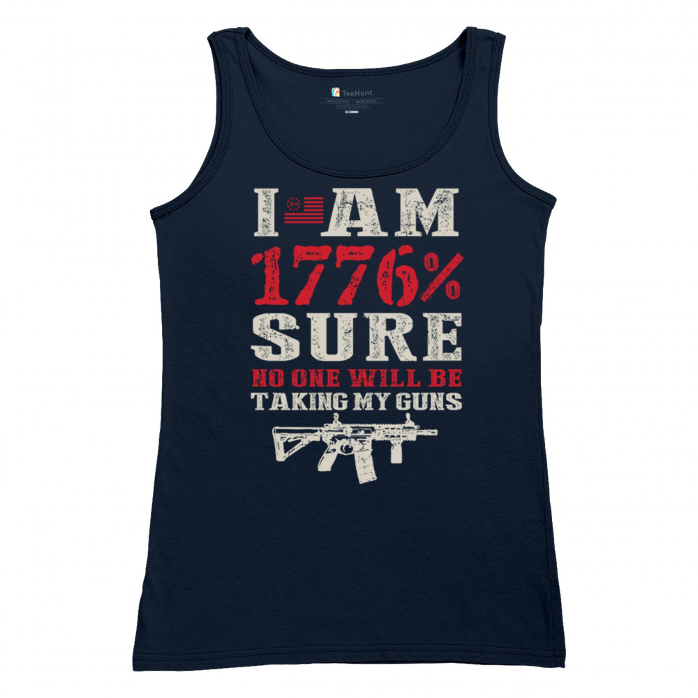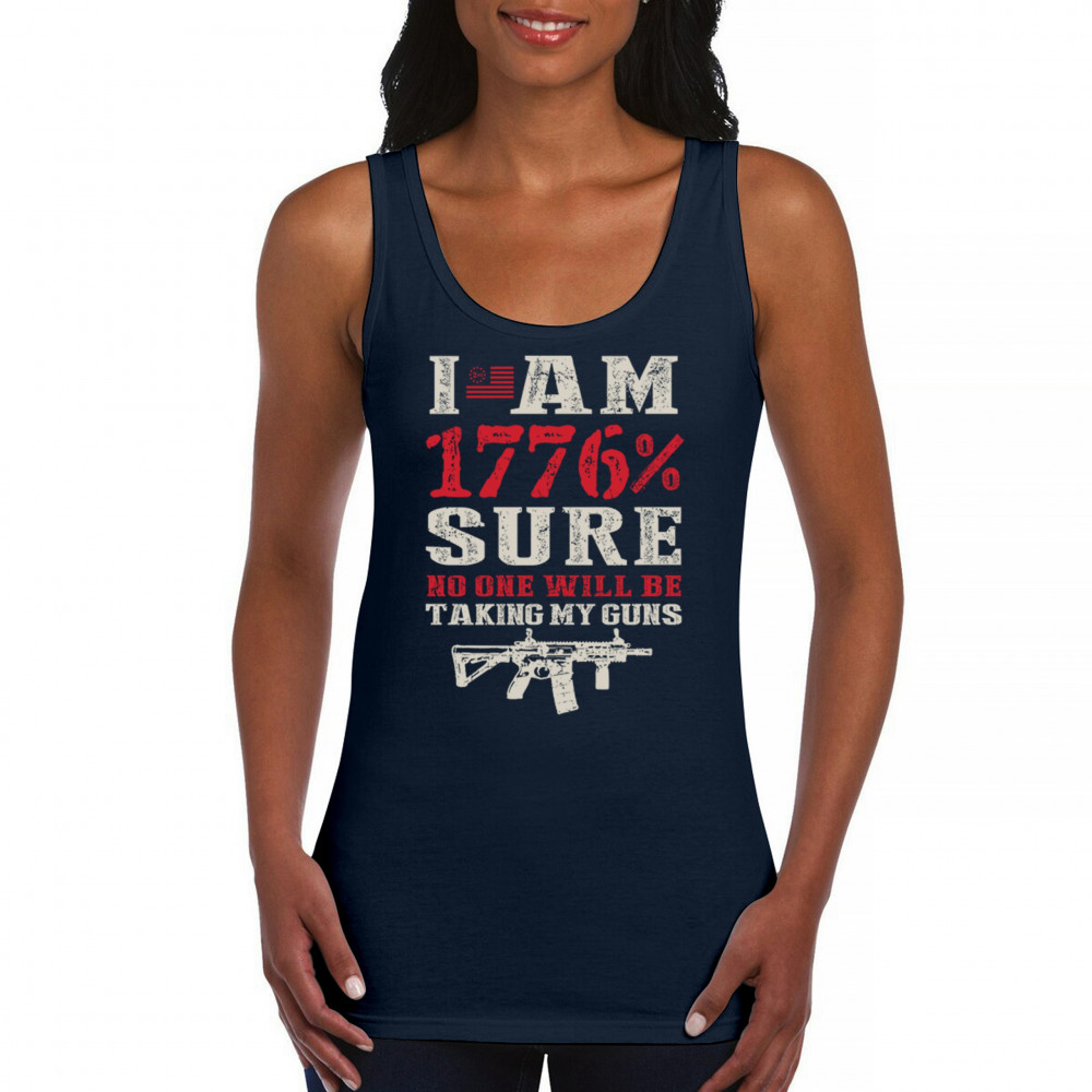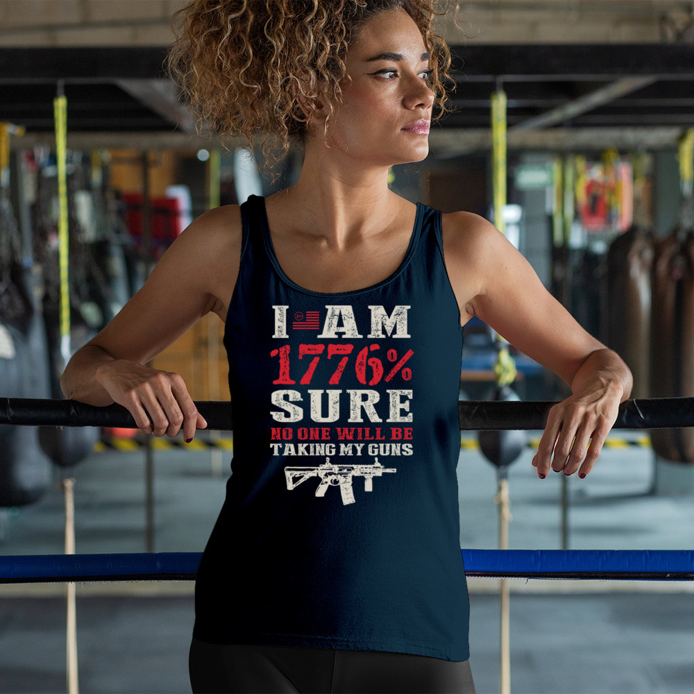 This eye-catching design shouts American pride with its 1776% certainty and pro-gun message. A distressed rifle graphic pairs with bold lettering and patriotic red, white, and blue styling. Perfect for gun owners, liberty advocates, and veterans who take their constitutional rights seriously. A true celebration of freedom and firepower.