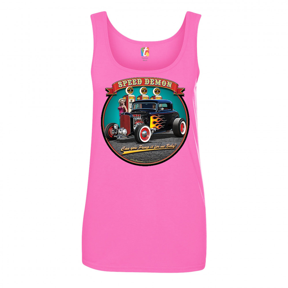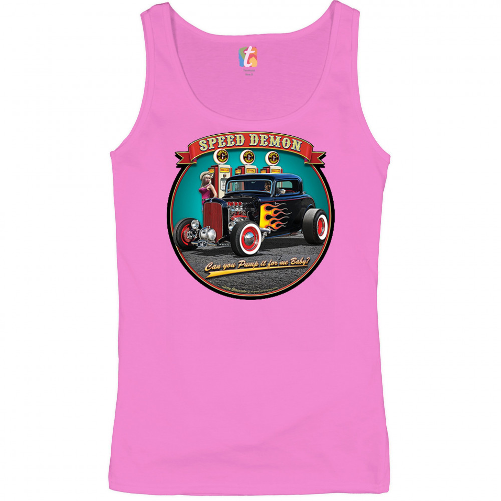 A print featuring a 1932 Ford Deuce hot rod coupe standing by a gas station. There is a cowgirl leaning on a gas pump. The print says: "speed demon" and underneath the car "Can you Pump it for me baby?". A great choice for Route 66 and hot rod fans.