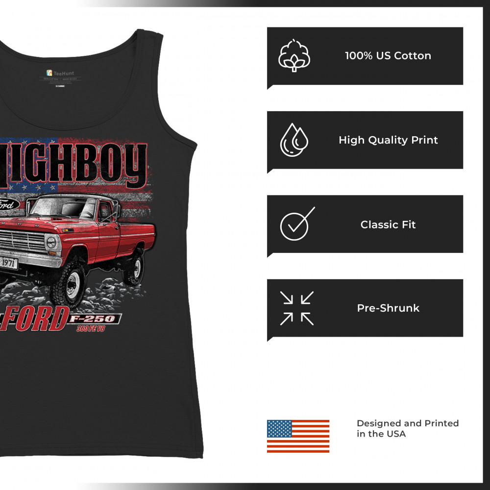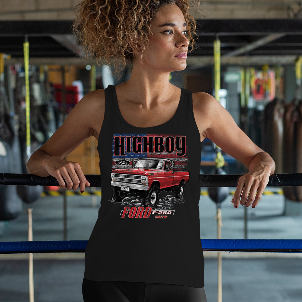 This vintage truck design features a 1971 Ford F-250 Highboy 4x4 with a classic lifted stance and patriotic flag background. Bold and nostalgic, it’s perfect for classic truck fans, 4x4 lovers, off-roaders, and collectors who appreciate American V8 tradition. Show it off at truck shows, meets, or cruise nights.
