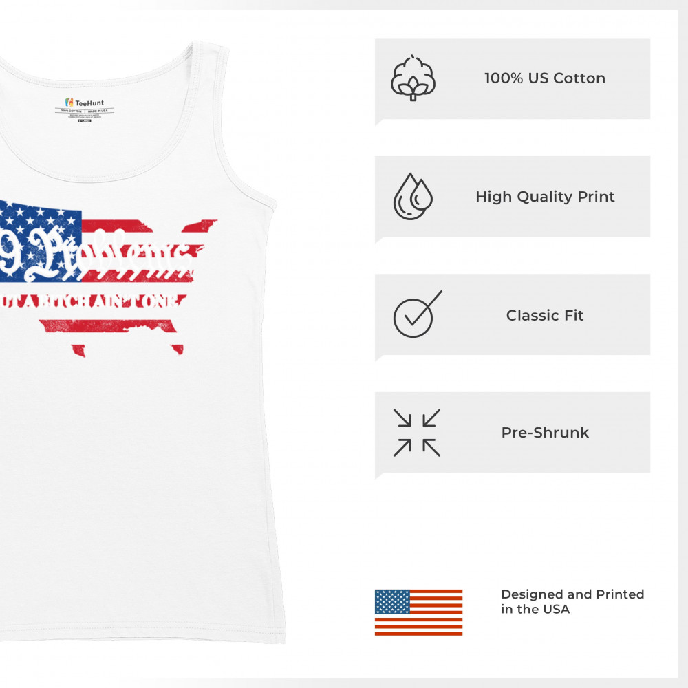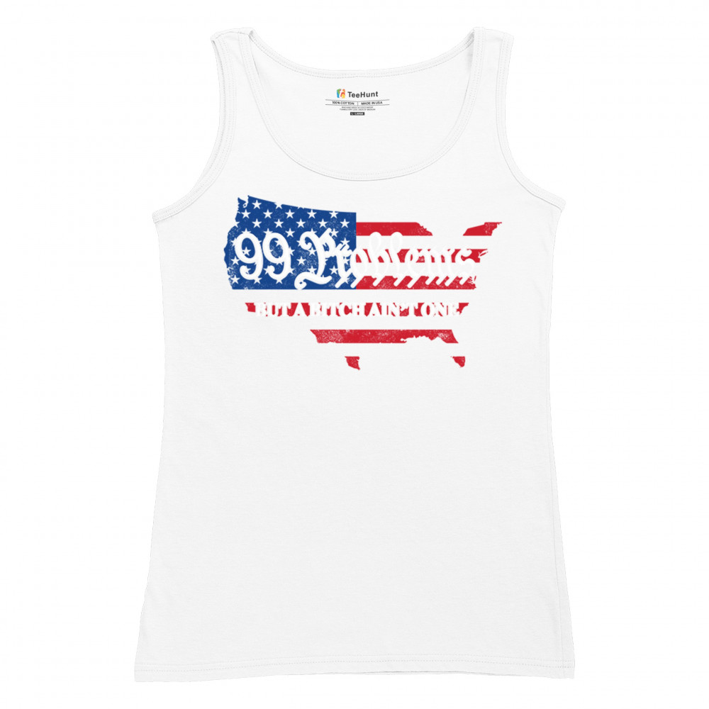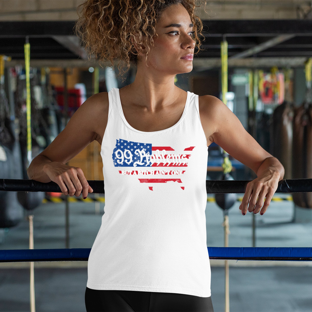 Embrace your patriotic spirit with this striking "99 Problems But a B*tch Ain't One" design, blending the American map and flag-inspired elements. Perfect for Trump supporters, conservatives, and all who believe in the values of freedom, victory, and the Republican Red Wave. Celebrate your commitment to America and make a statement that reflects your unwavering belief in the people's mandate and the party of common sense.