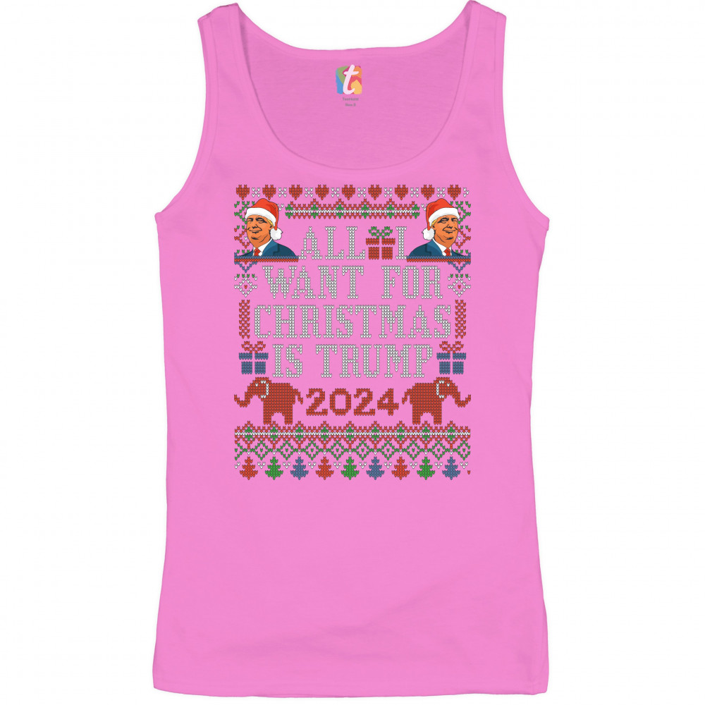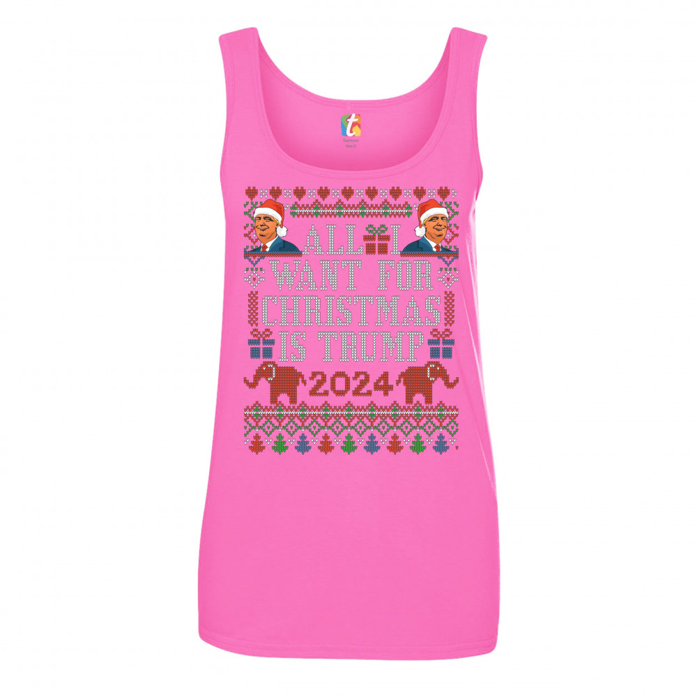 A funny print saying: "All I Want for Christmas Is Trump 2024". The print is decorated as a Christmas ugly sweater and features faces of Donald Trump wearing Christmas hats and two elephants. A great choice to wear for a Christmas or New Year's Eve party