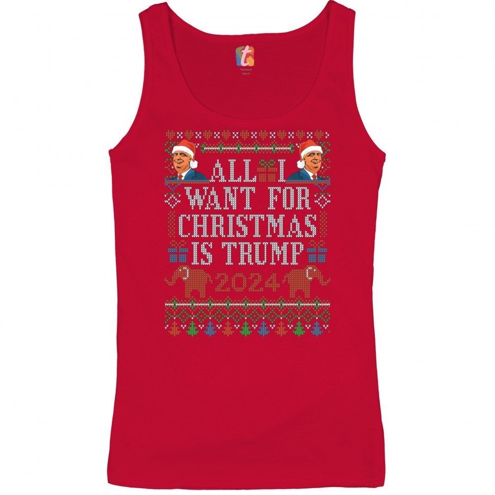 A funny print saying: "All I Want for Christmas Is Trump 2024". The print is decorated as a Christmas ugly sweater and features faces of Donald Trump wearing Christmas hats and two elephants. A great choice to wear for a Christmas or New Year's Eve party
