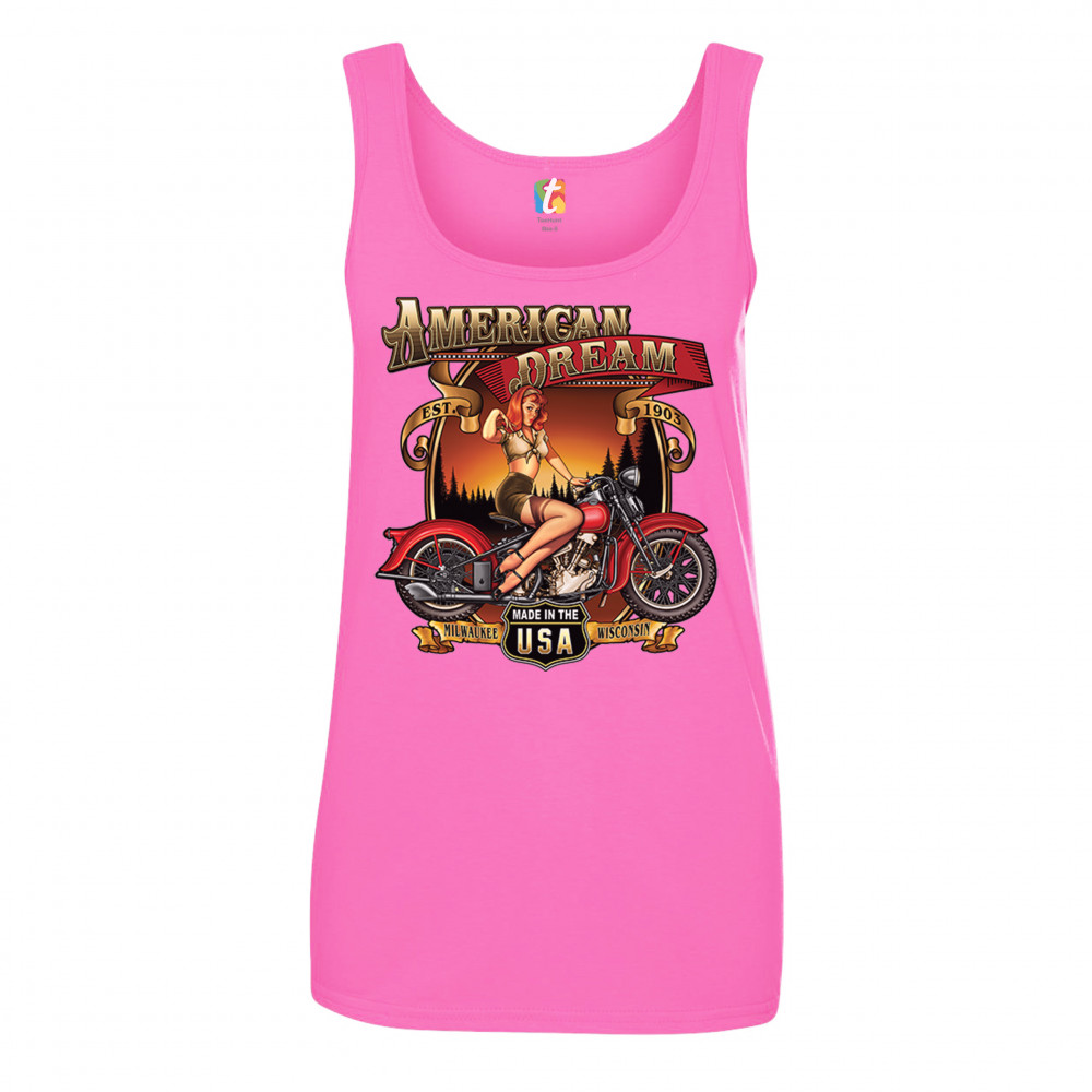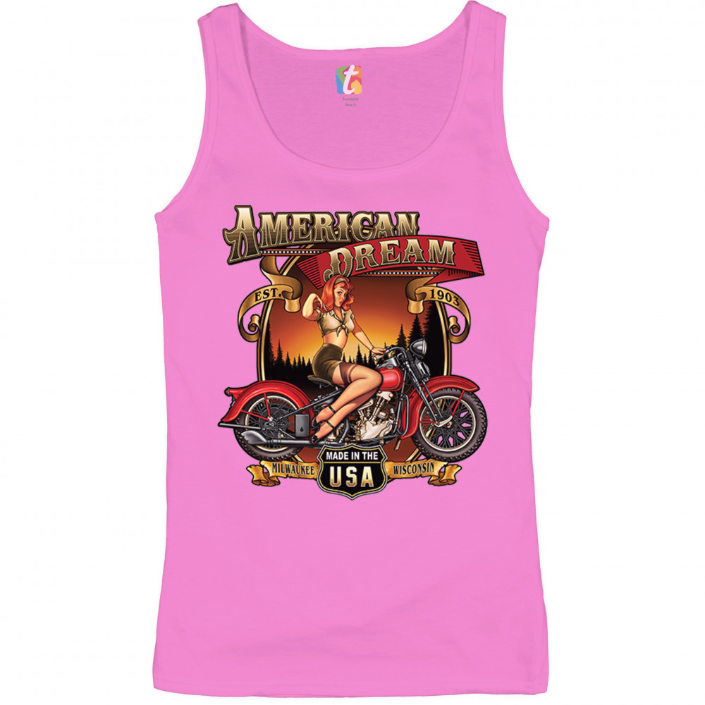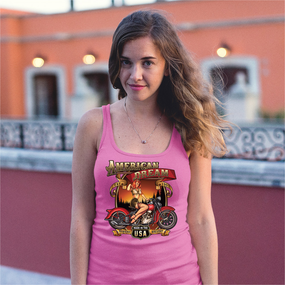 A print featuring a sexy pin up girl sitting on a vintage motorcycle. The print says: "American Dream est. 1903". In the bottom there is a sign saying: "made in the USA". To the left and right of it "Milwaukee Wisconsin" is written on a stripe. Great choice for any motorcycle enthusiast.