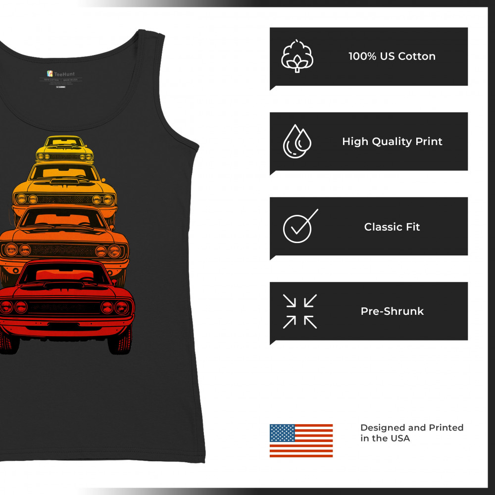 Celebrate horsepower heritage with this colorful lineup of classic muscle cars. Featuring a stacked gradient from red to yellow, this design brings bold retro attitude, V8 pride, and American torque to life. Perfect for collectors, gearheads, and fans of classic car power.