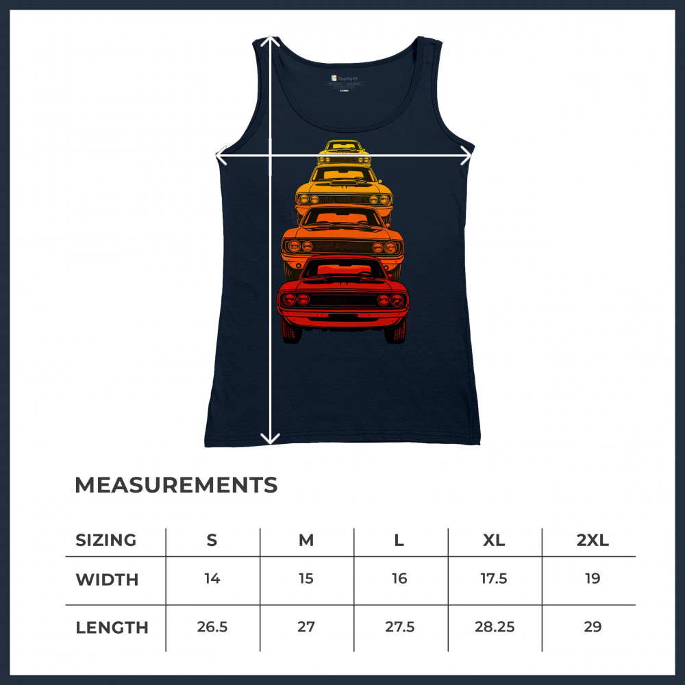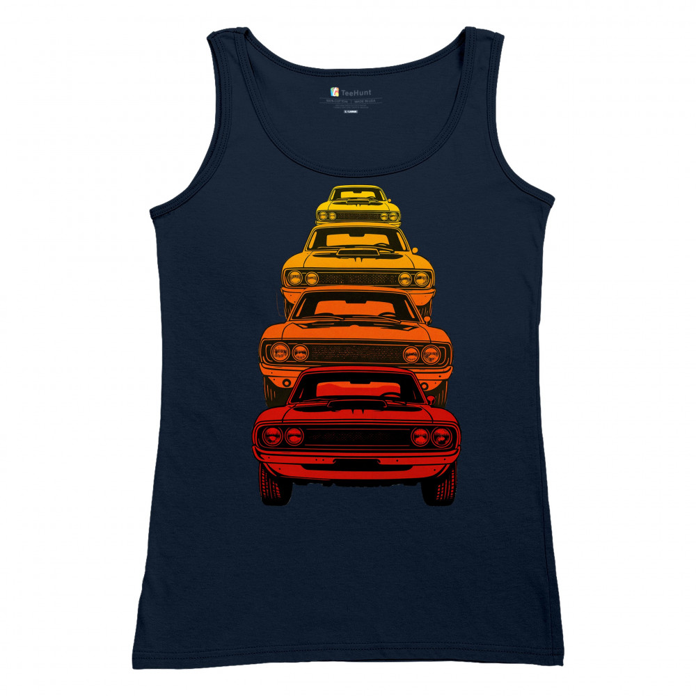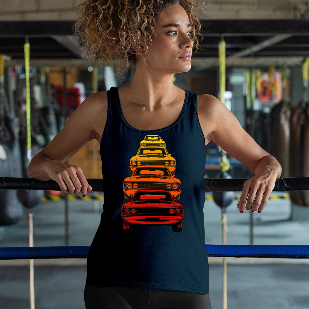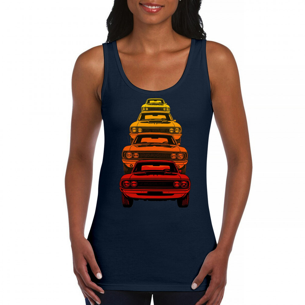 Celebrate horsepower heritage with this colorful lineup of classic muscle cars. Featuring a stacked gradient from red to yellow, this design brings bold retro attitude, V8 pride, and American torque to life. Perfect for collectors, gearheads, and fans of classic car power.