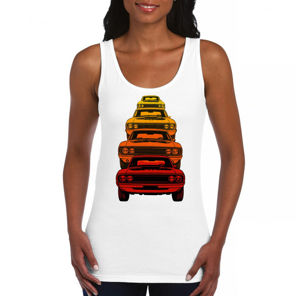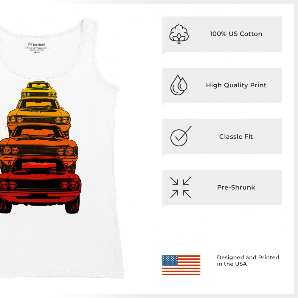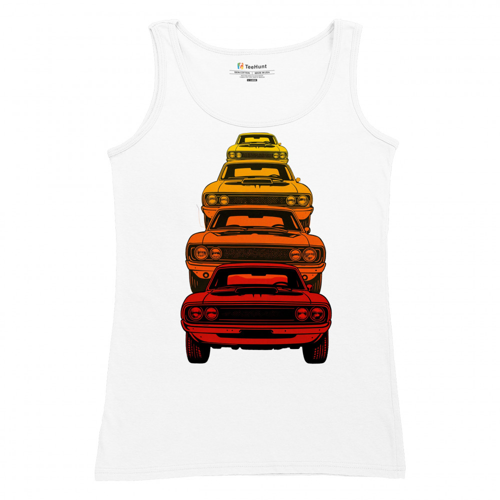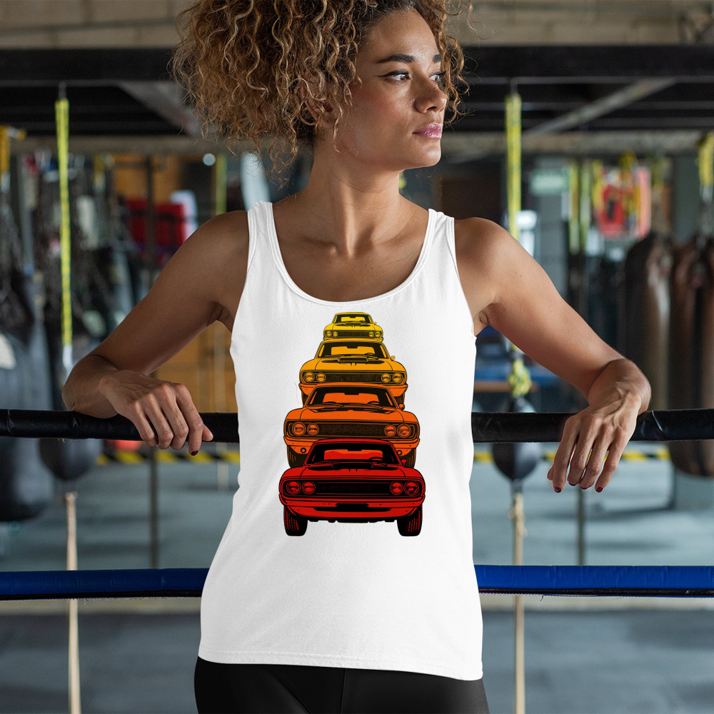 Celebrate horsepower heritage with this colorful lineup of classic muscle cars. Featuring a stacked gradient from red to yellow, this design brings bold retro attitude, V8 pride, and American torque to life. Perfect for collectors, gearheads, and fans of classic car power.