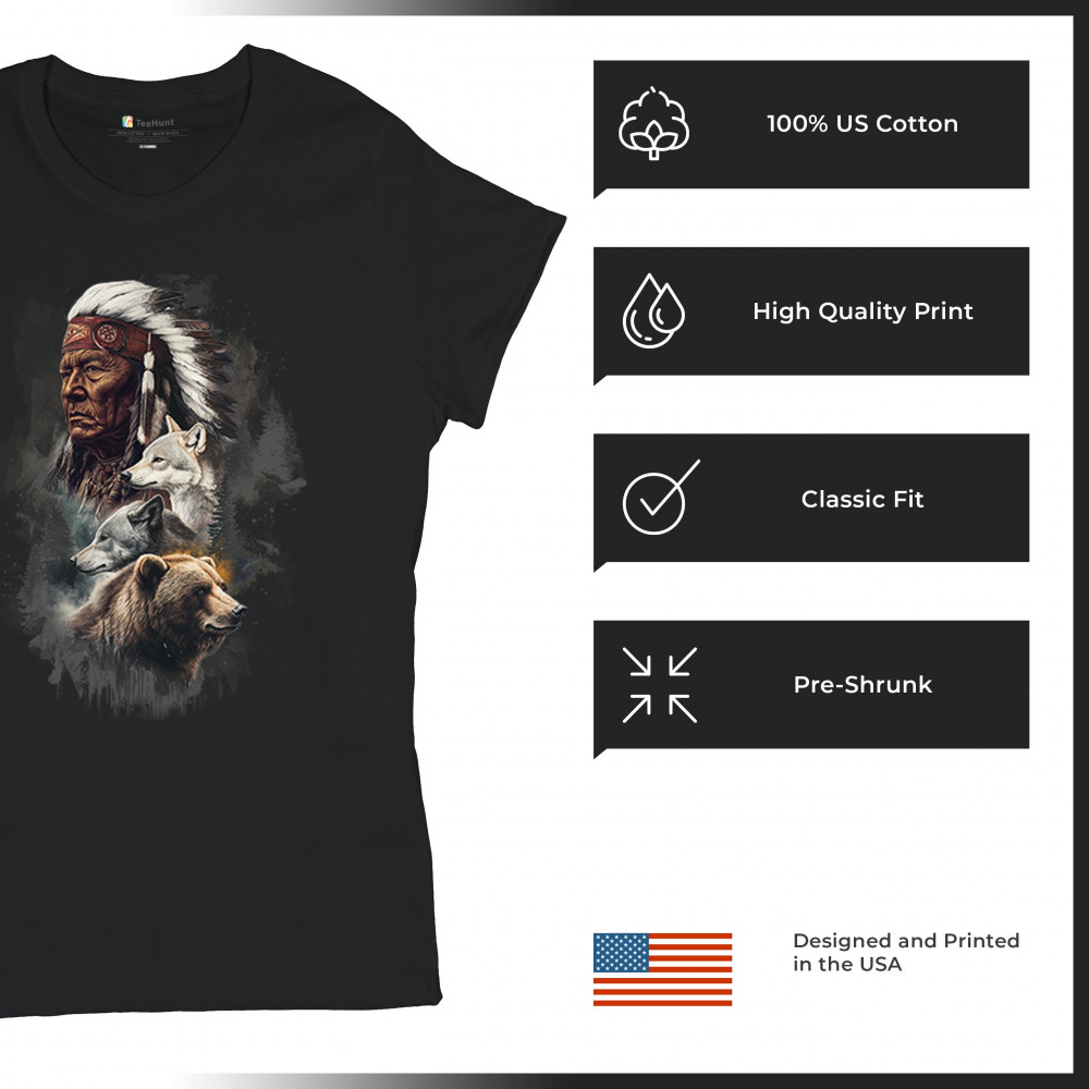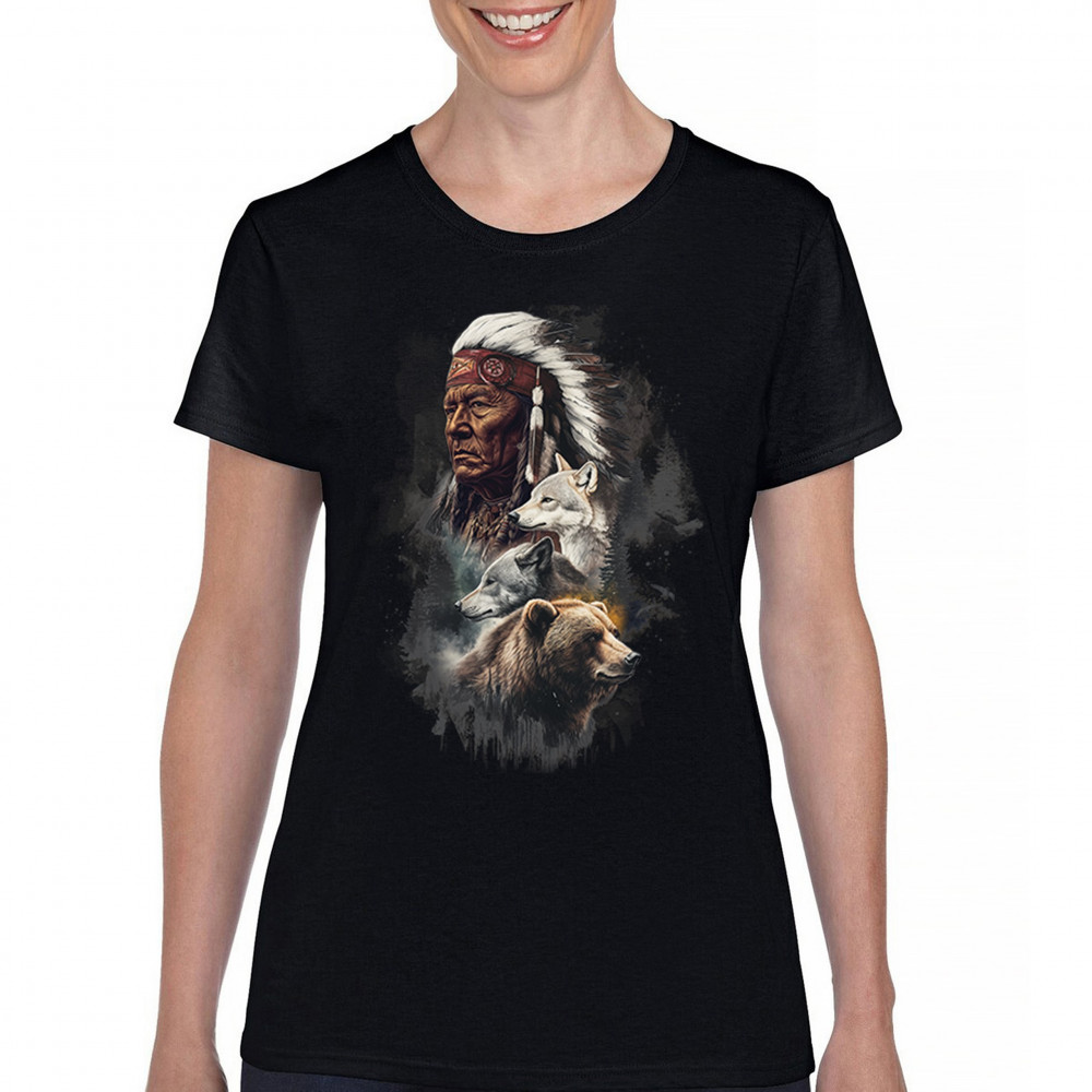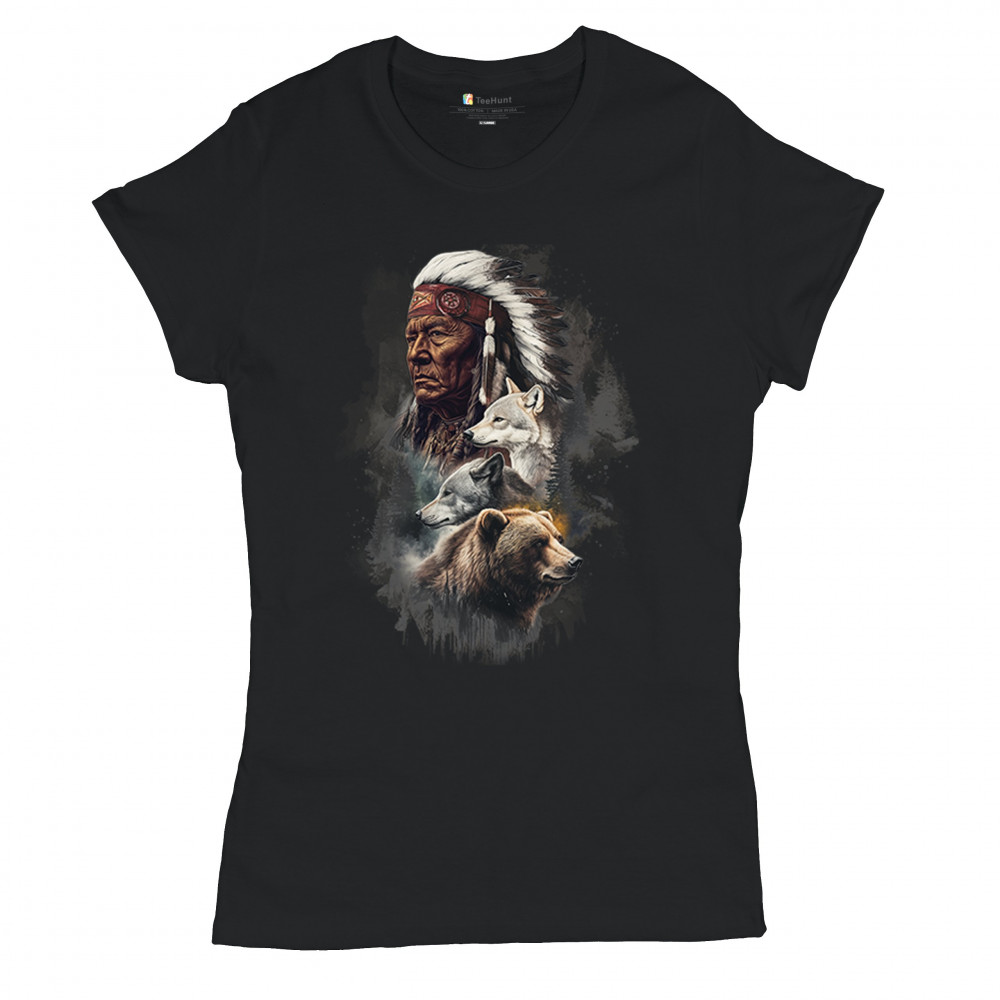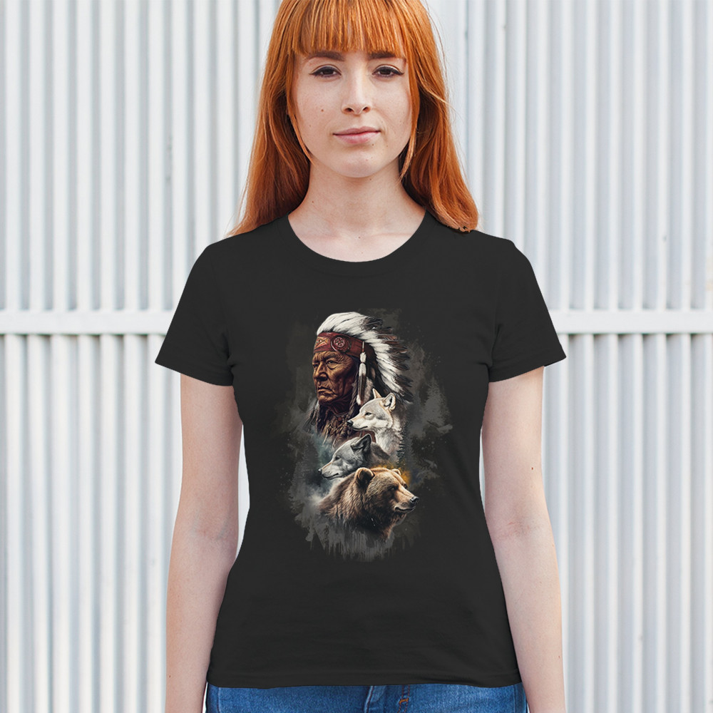 Celebrate spiritual strength and heritage with this design featuring a Native American elder alongside wolves and a bear. This tribal and totemic art reflects wisdom, guardianship, and deep forest spirit energy. Perfect for cultural pride, animal lovers, and those connected to spiritual symbolism in nature.