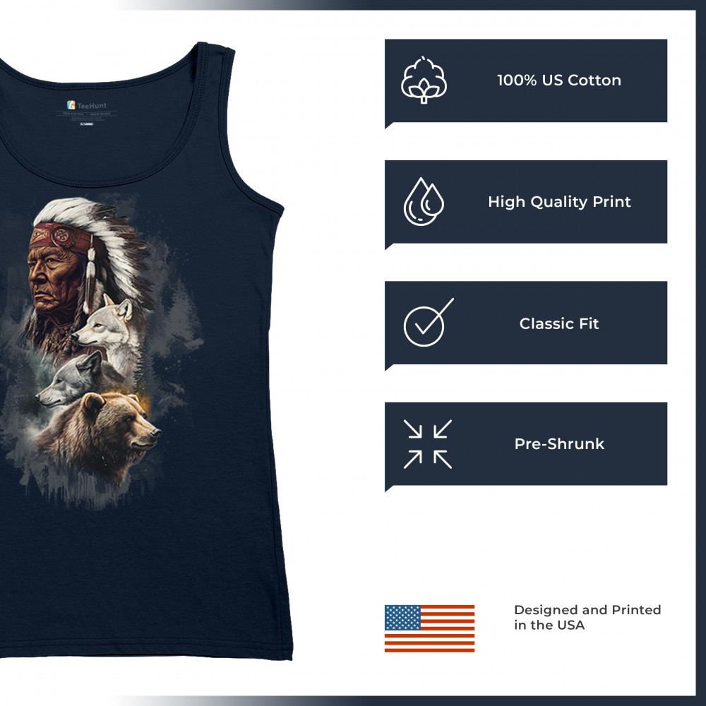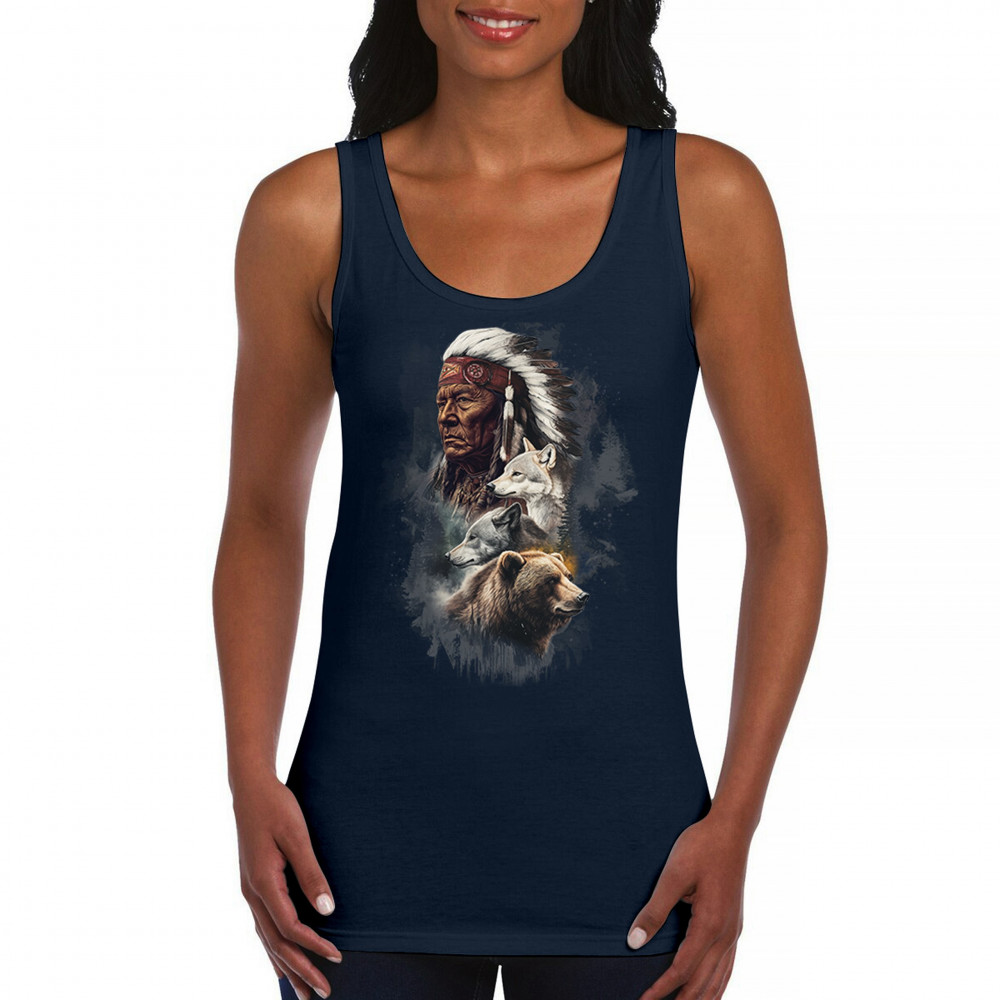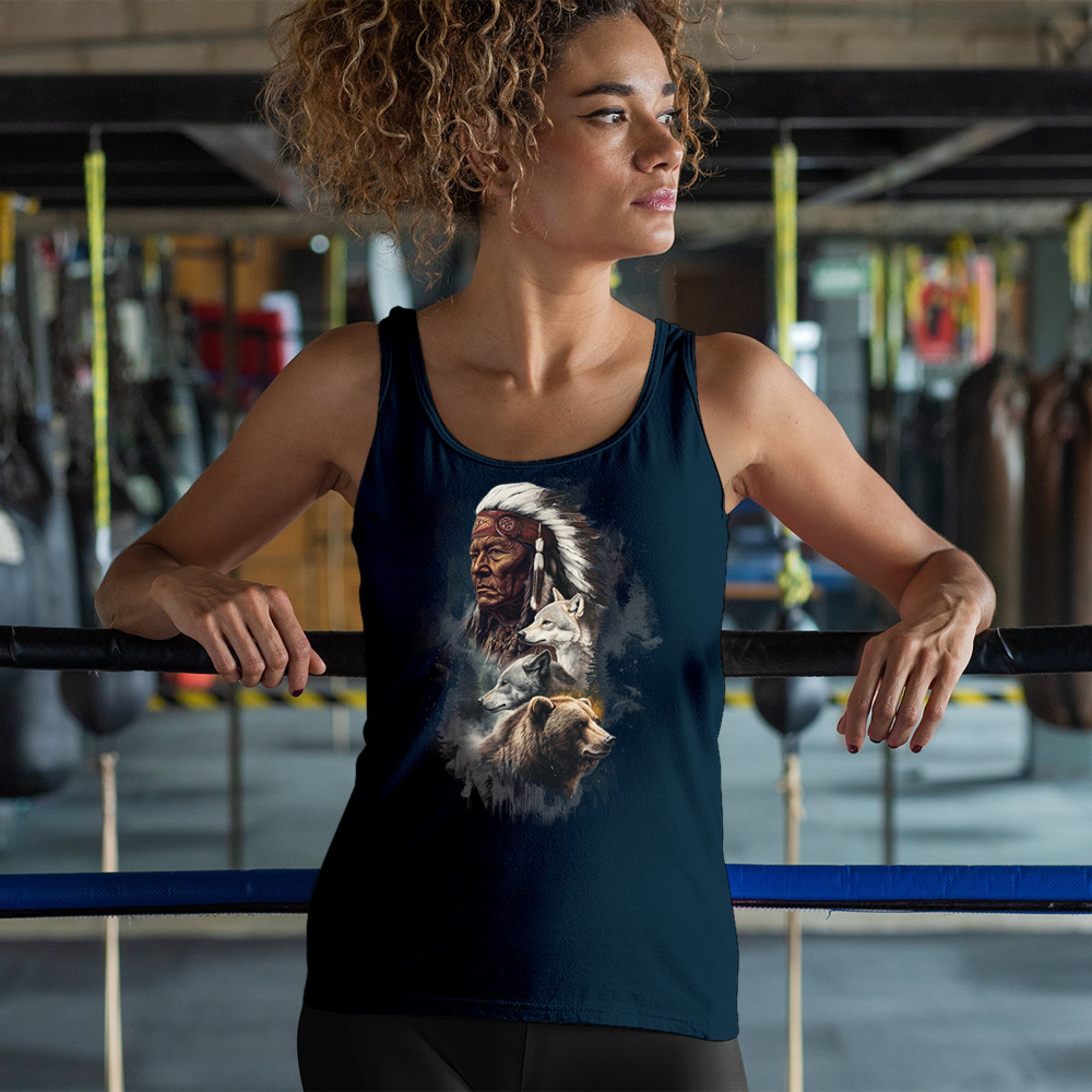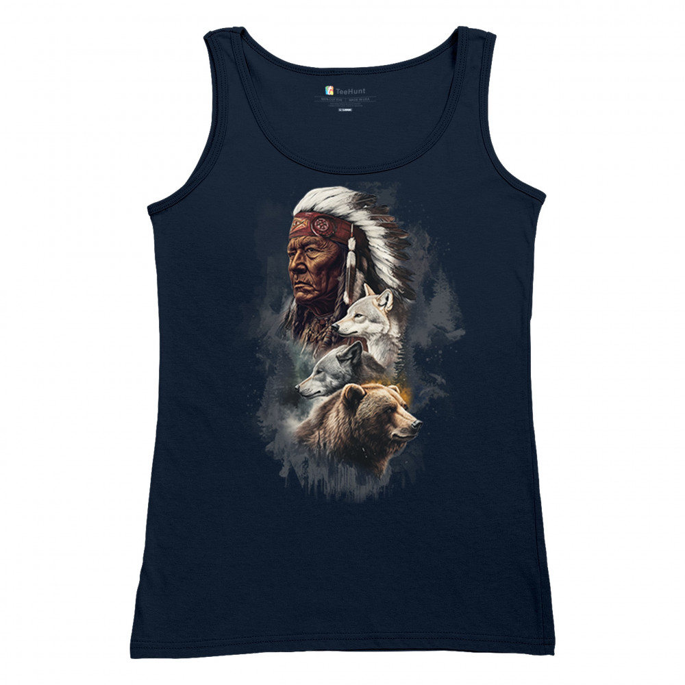 Celebrate spiritual strength and heritage with this design featuring a Native American elder alongside wolves and a bear. This tribal and totemic art reflects wisdom, guardianship, and deep forest spirit energy. Perfect for cultural pride, animal lovers, and those connected to spiritual symbolism in nature.