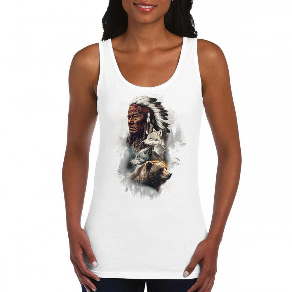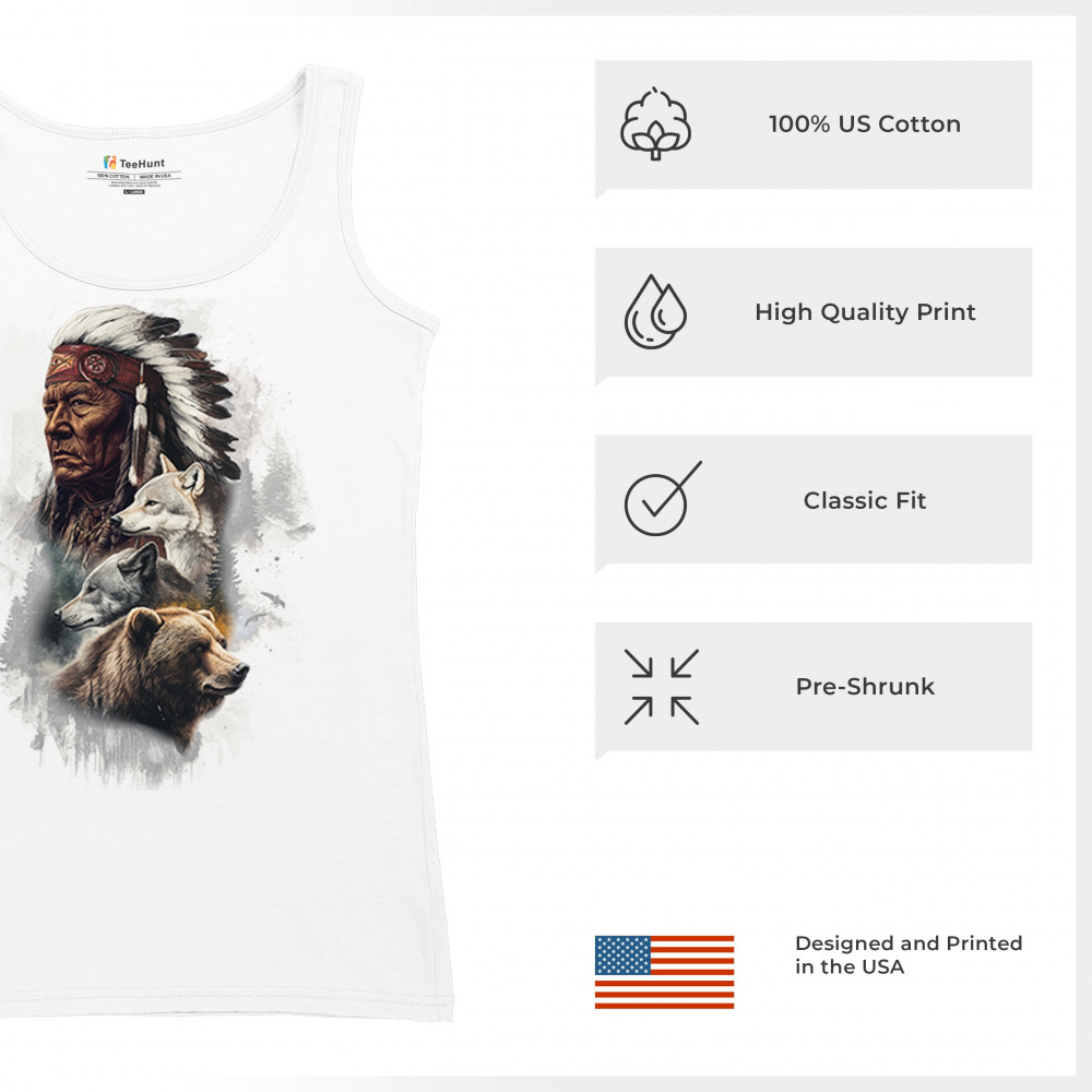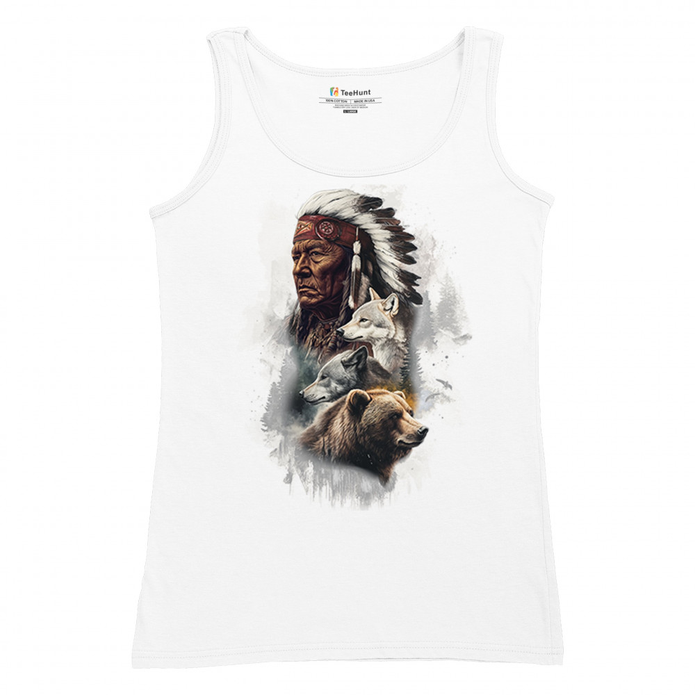 Celebrate spiritual strength and heritage with this design featuring a Native American elder alongside wolves and a bear. This tribal and totemic art reflects wisdom, guardianship, and deep forest spirit energy. Perfect for cultural pride, animal lovers, and those connected to spiritual symbolism in nature.