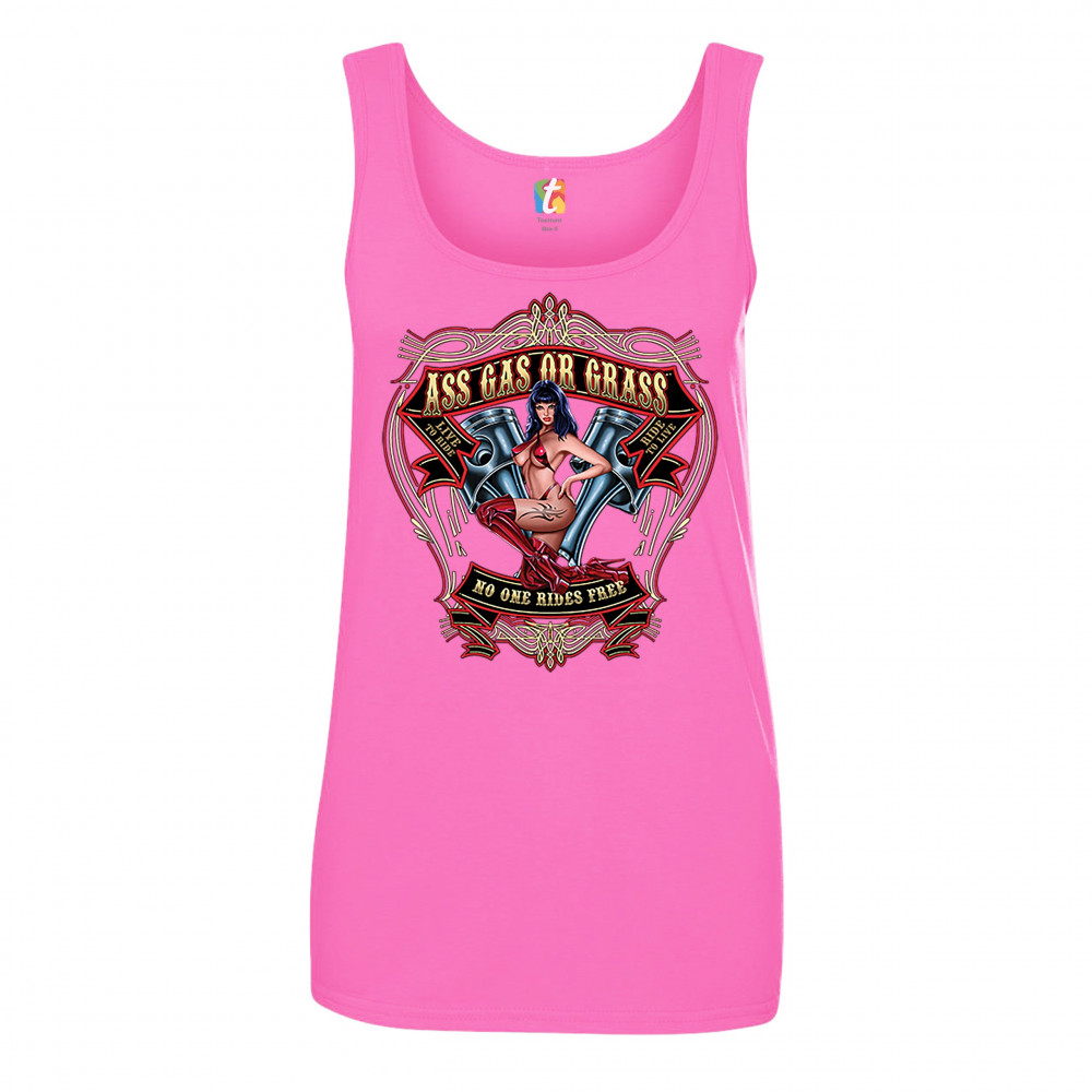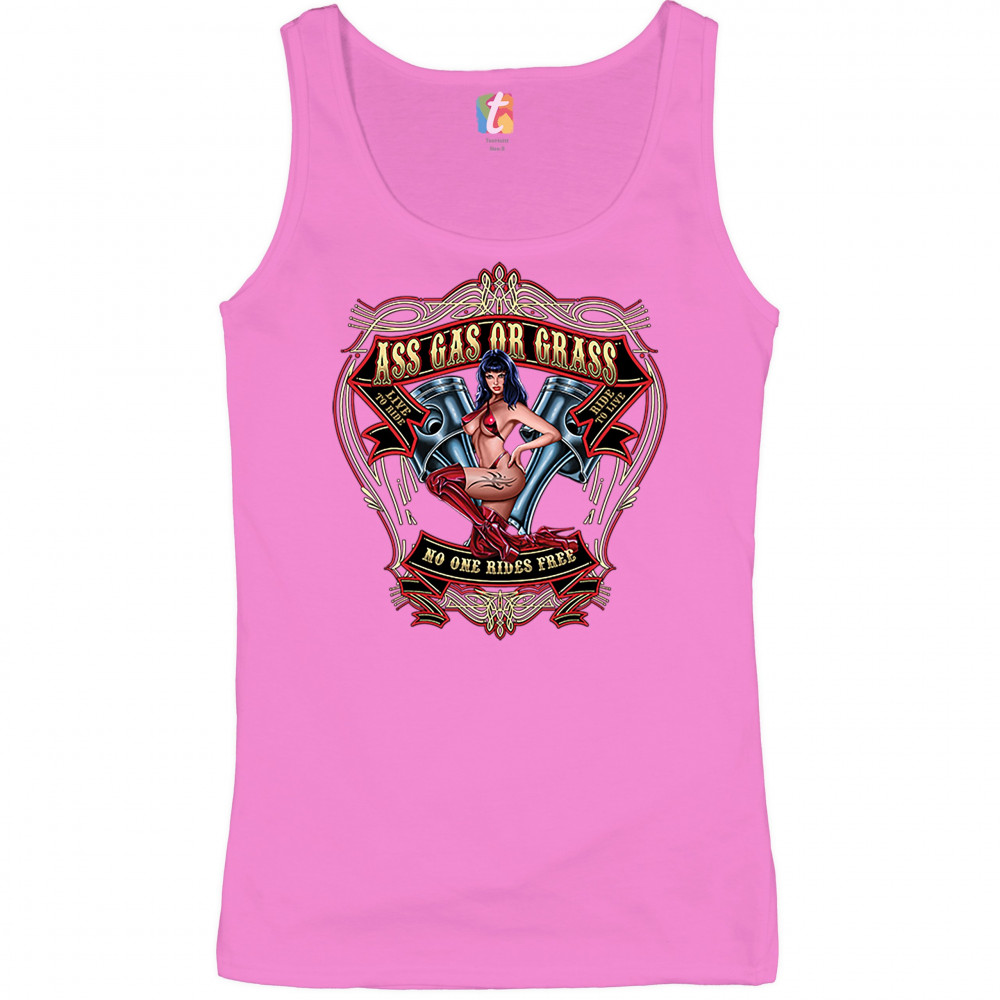 A print featuring a sexy girl in high heels. On multiple stripes or signs the print says: "Ass Gas or Grass, Live to Ride, Ride to Live, No One Rides Free". There are huge pistons in the background. A great choice for a motorcycle enthusiast.