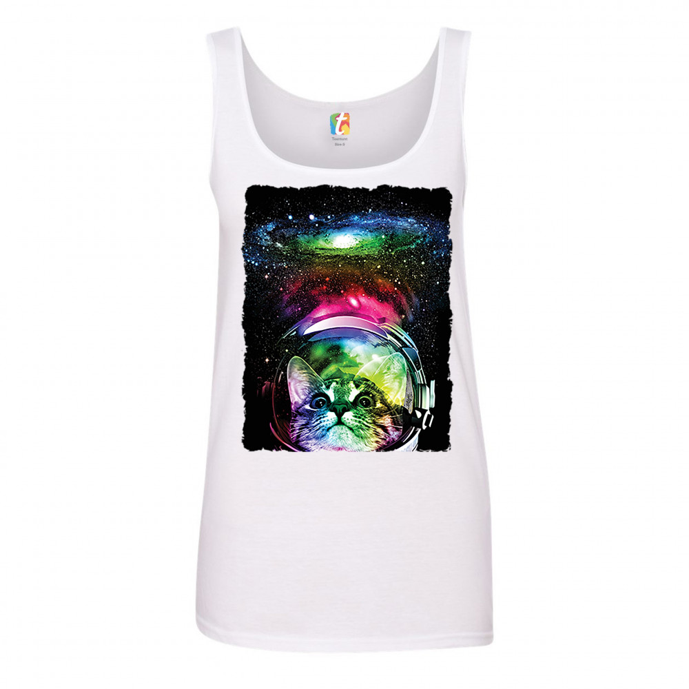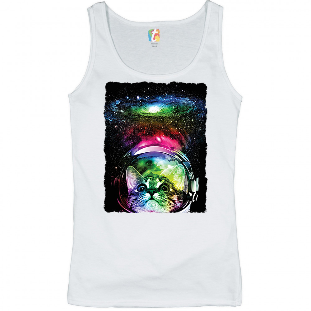 A beautiful print featuring a cat in space wearing a helmet. Above the cat's head there is a galaxy. A great choice for any cat person and space enthusiast.