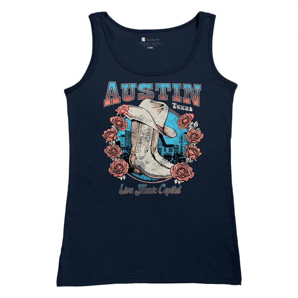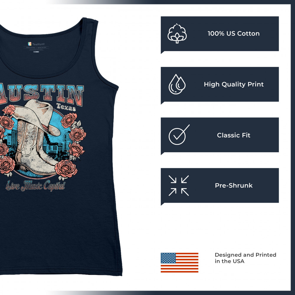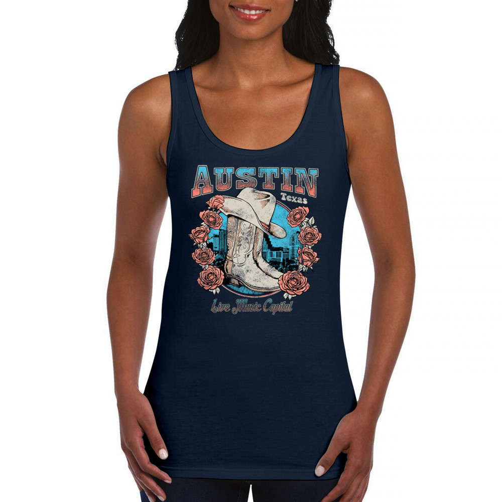 Austin TX Live Music Capital comes alive in this vintage cowgirl boots and hat design, accented by roses and the city skyline. Perfect for lovers of country music, honkytonk vibes, and western chic, this design embodies southern spirit, rustic grit, and the proud Americana aesthetic of Texas’ iconic music scene.