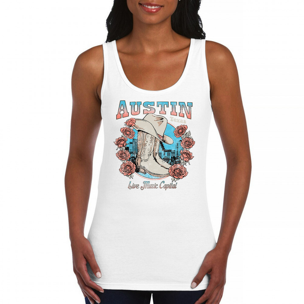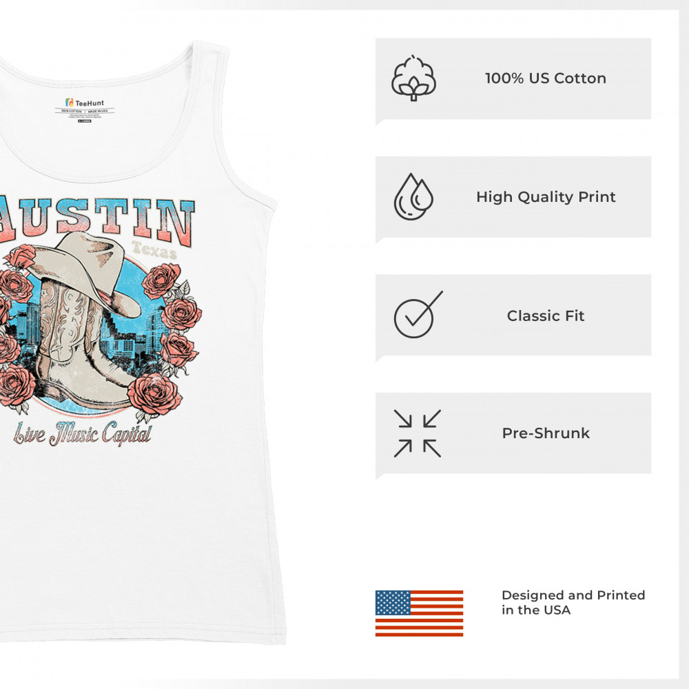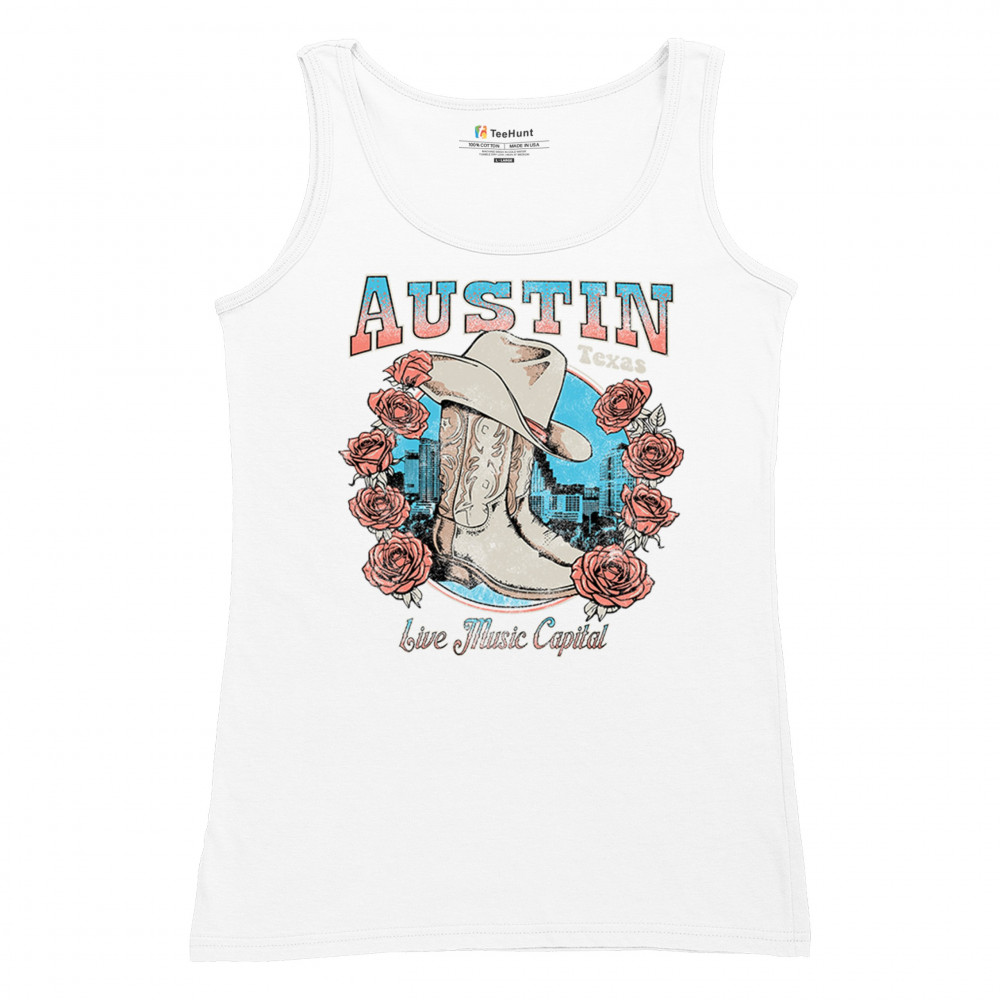 Austin TX Live Music Capital comes alive in this vintage cowgirl boots and hat design, accented by roses and the city skyline. Perfect for lovers of country music, honkytonk vibes, and western chic, this design embodies southern spirit, rustic grit, and the proud Americana aesthetic of Texas’ iconic music scene.