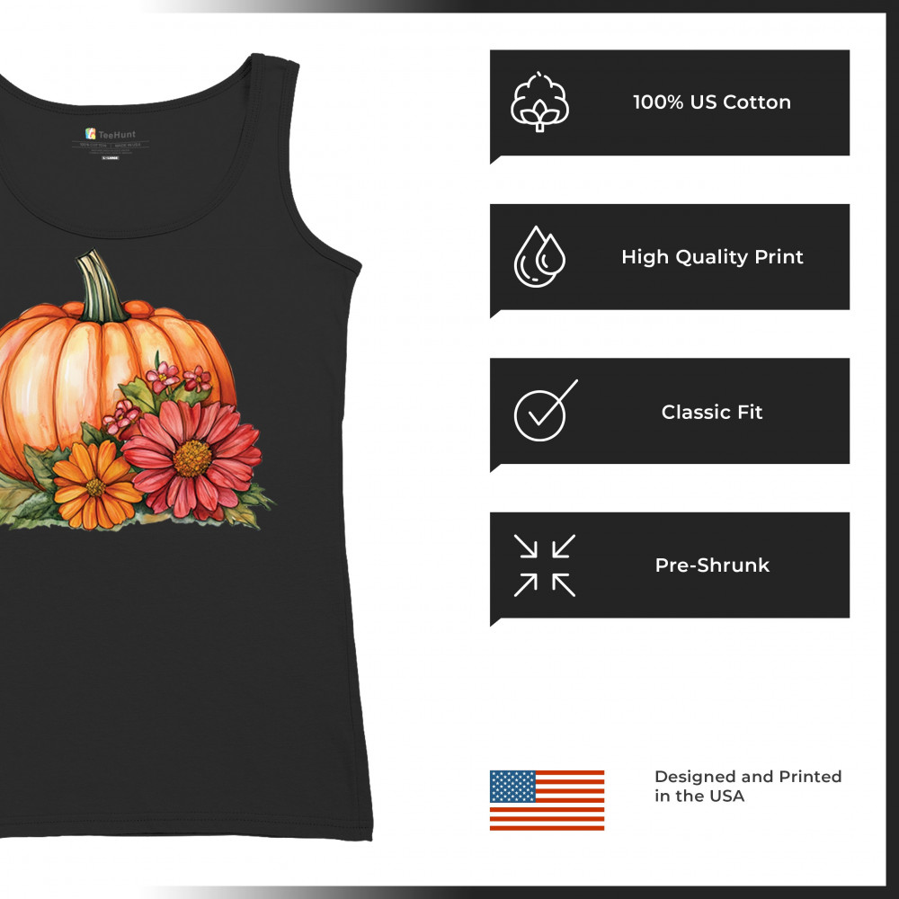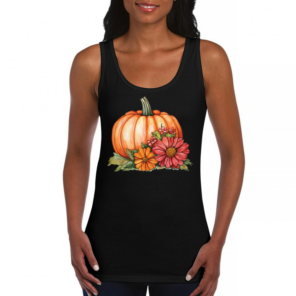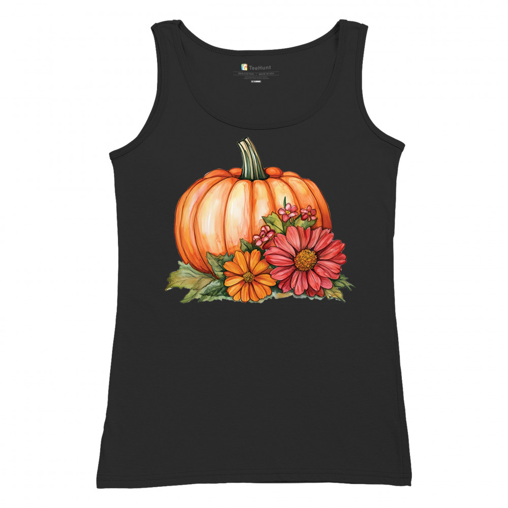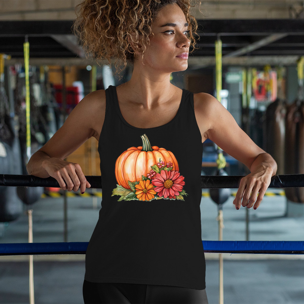 AUTUMN PUMPKIN WITH FLOWERS women's tank top cute cozy fall thanksgiving black