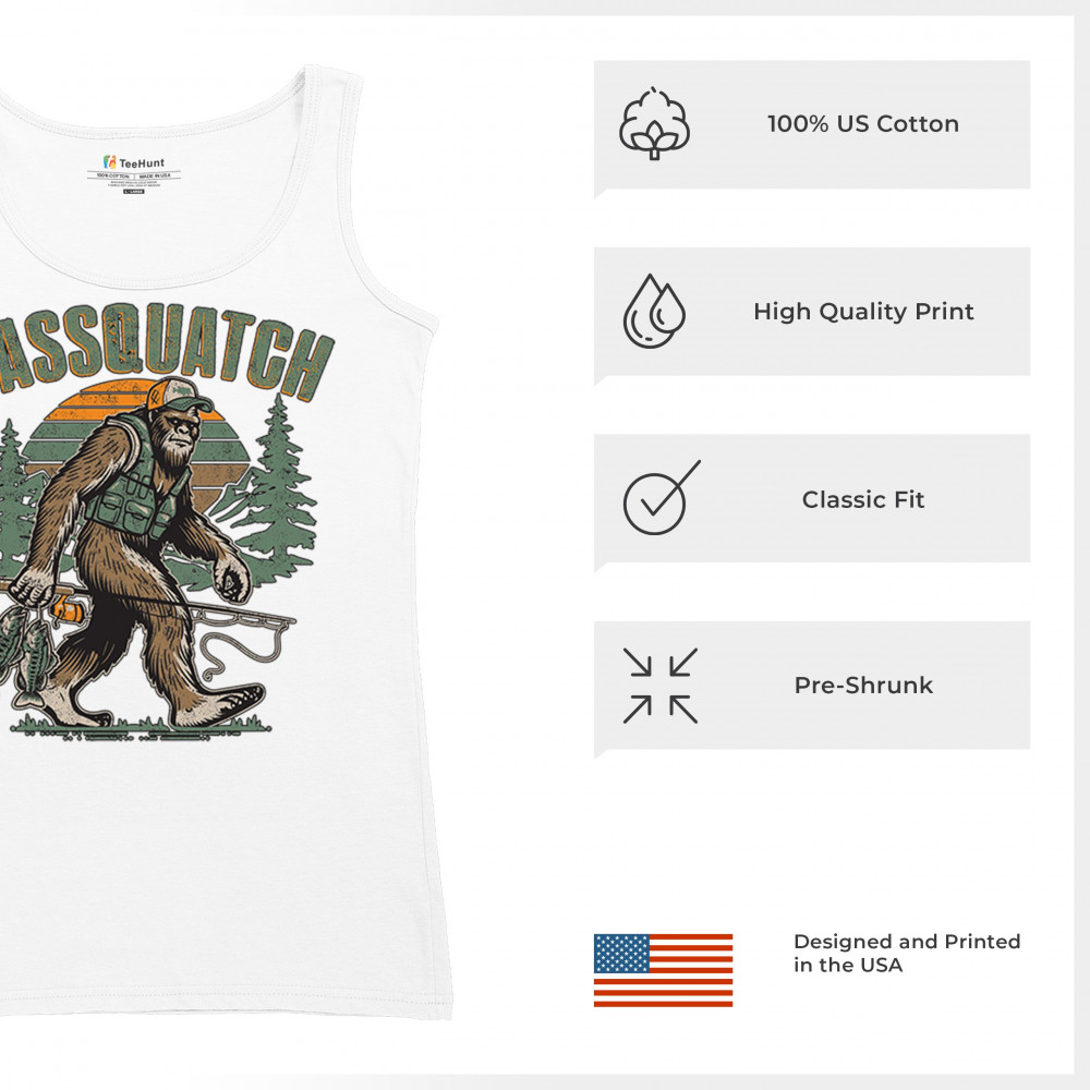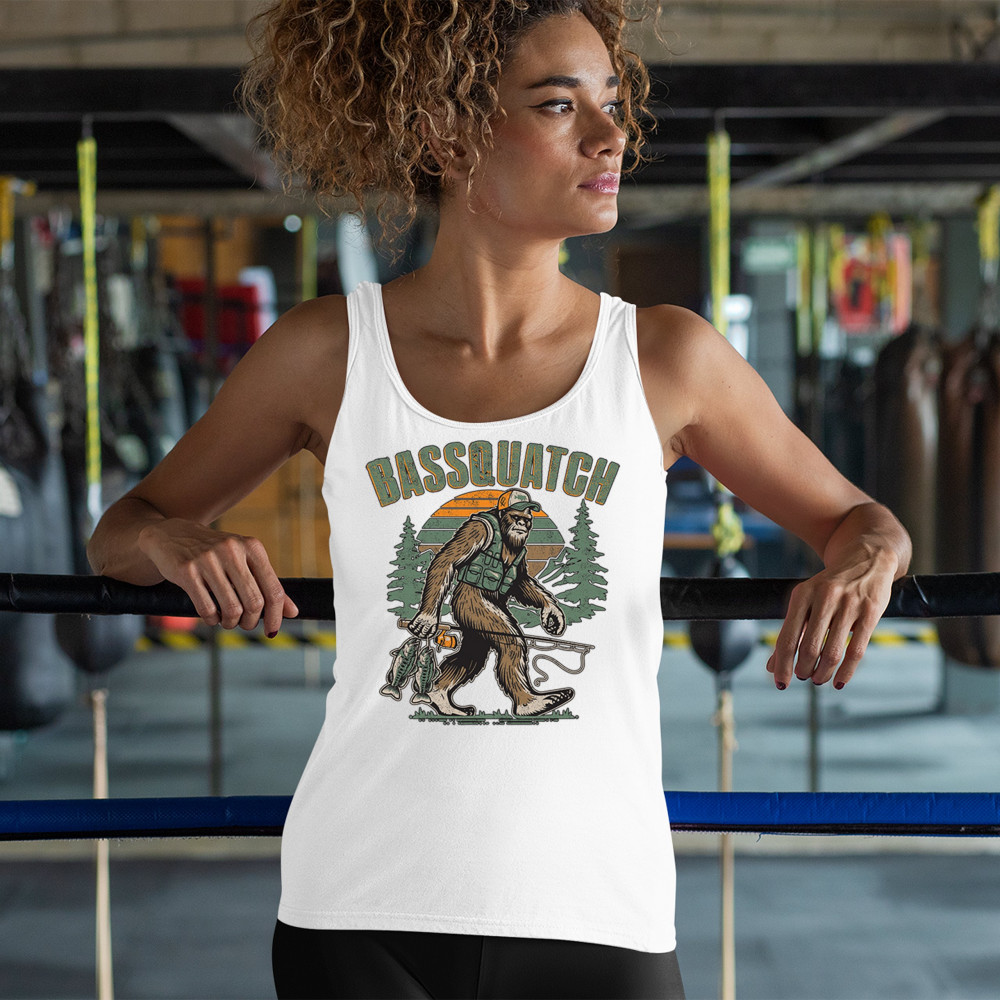Funny Bassquatch design blends Bigfoot, fishing humor, and retro forest style. Great for anglers, cryptid lovers, and outdoorsy pun fans.
