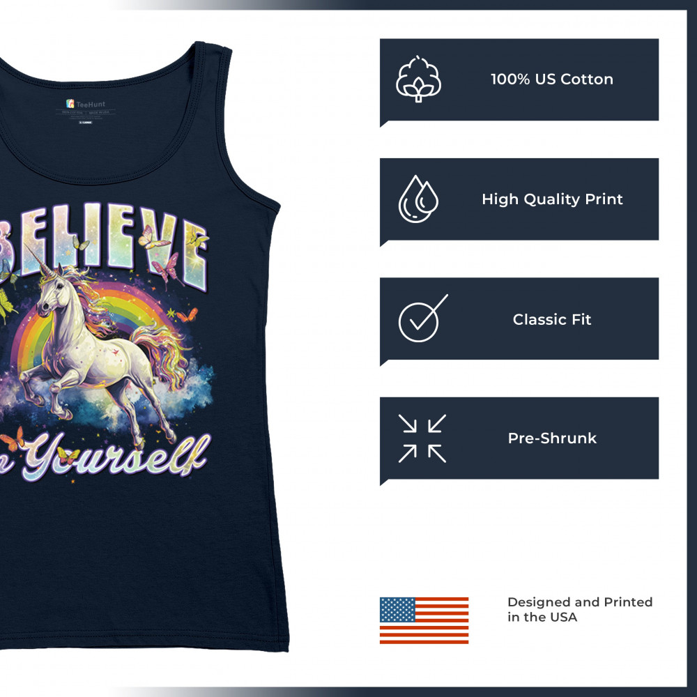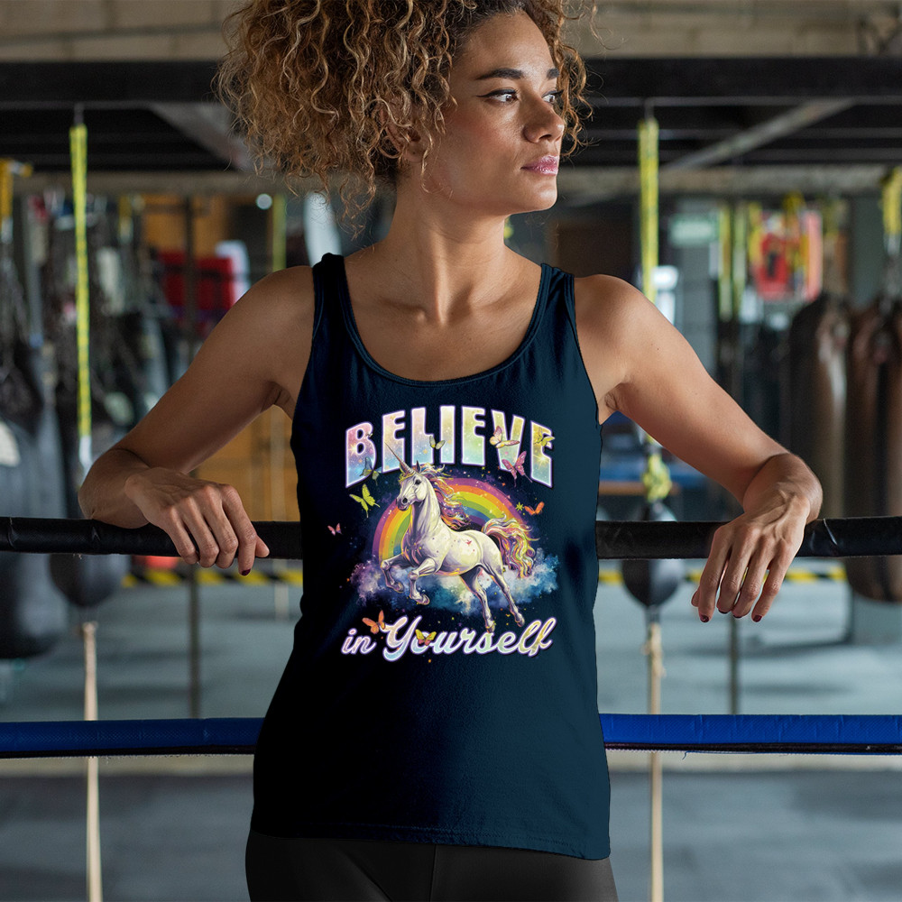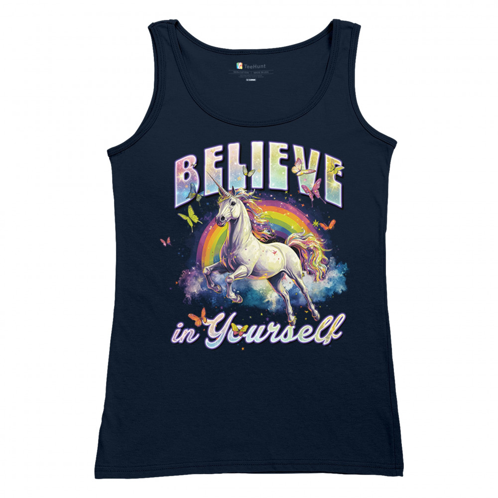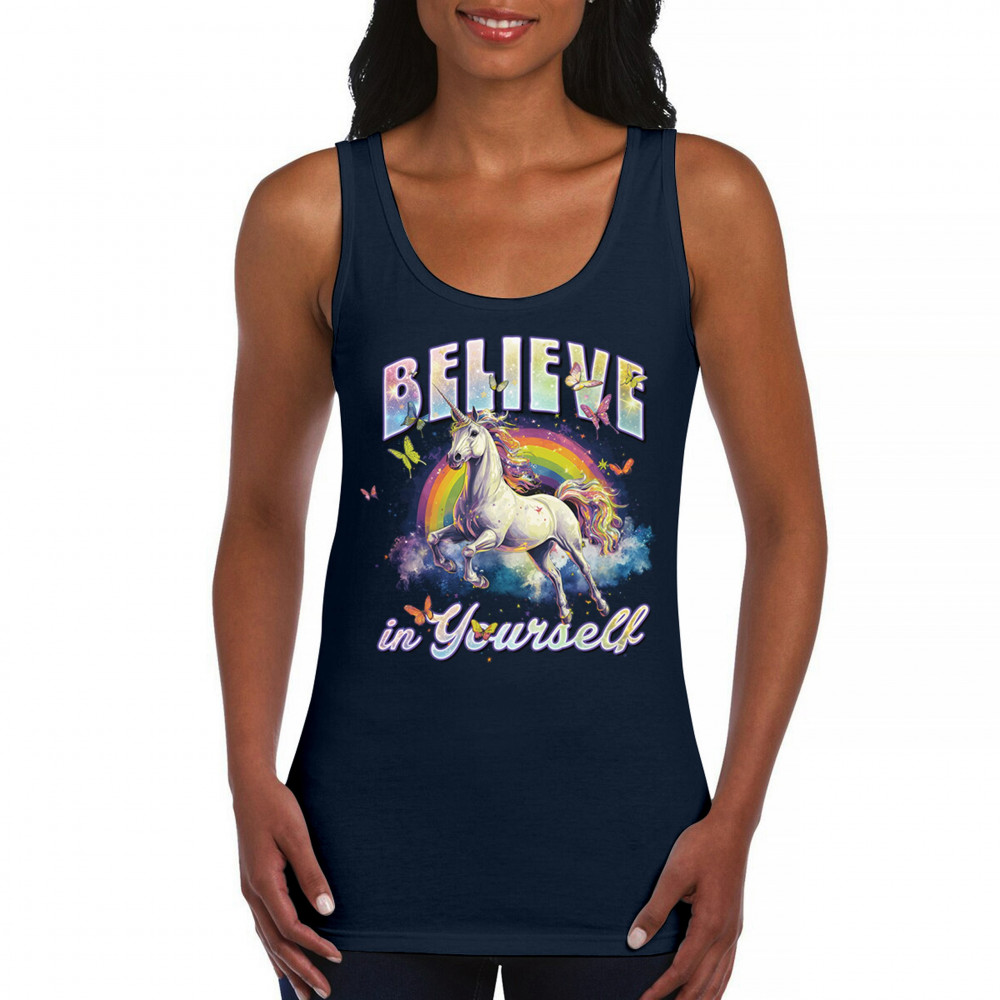 Believe in Yourself unicorn rainbow design with whimsical unicorn shirt, fantasy rainbow style, enchanted unicorn magic, galaxy sparkle, and positivity.