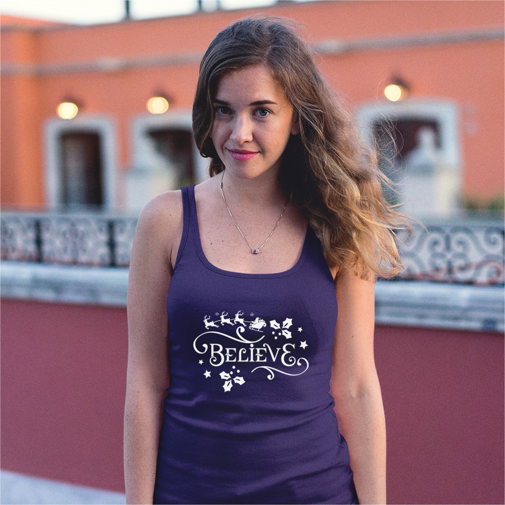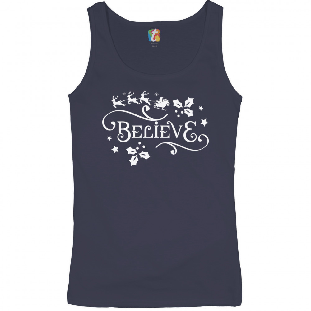 BELIEVE women's tank top merry christmas santa sleigh rudolph mistletoe navy blue