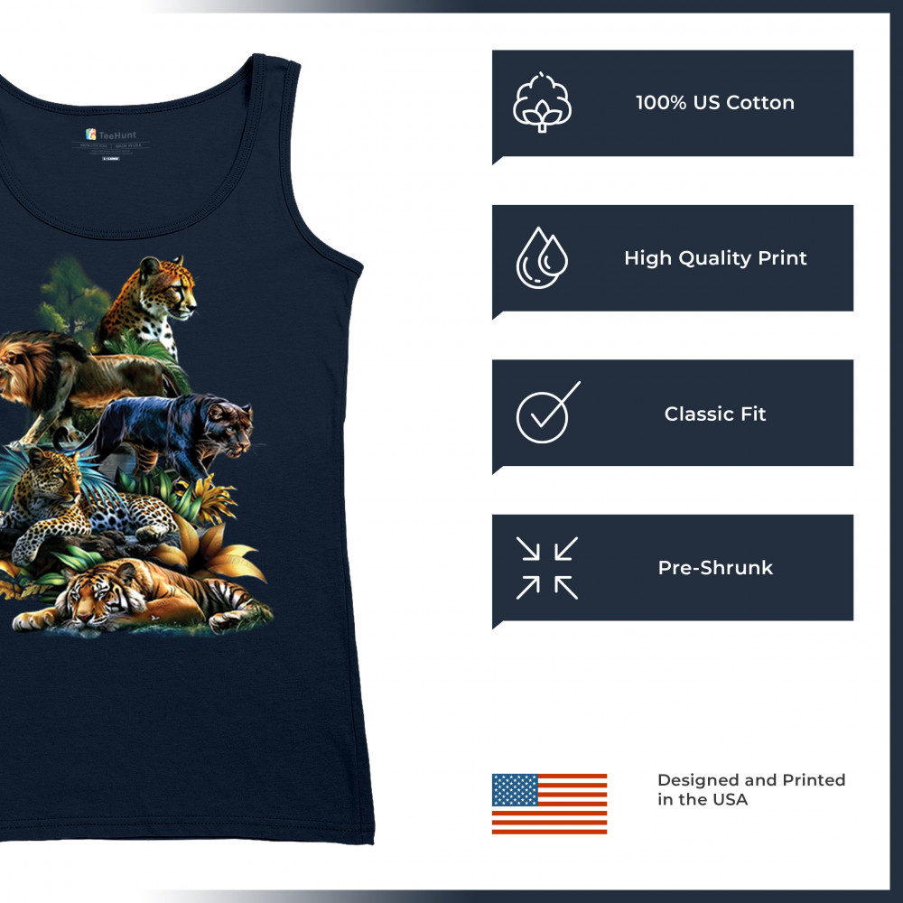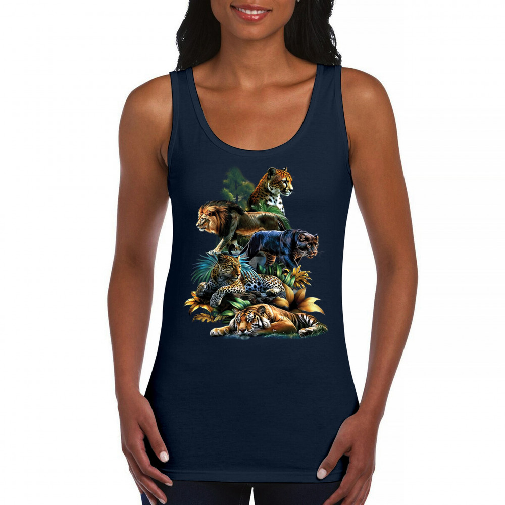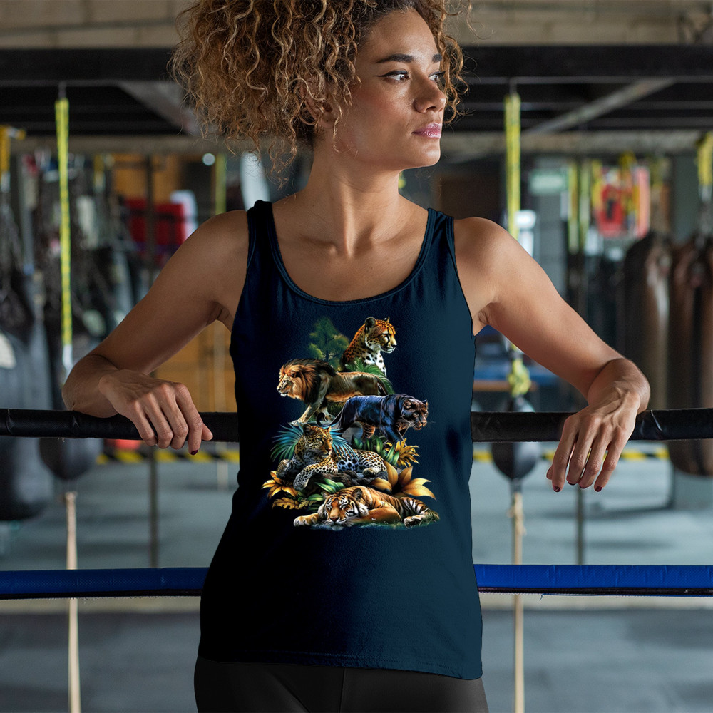Celebrate raw power and untamed beauty with this stunning big cat design featuring lion, tiger, cheetah, black panther, jaguar, and leopard. Surrounded by vivid jungle foliage, each animal radiates strength, pride, and wild spirit. Perfect for fans of nature, safari vibes, wildlife preservation, and fierce animal energy.