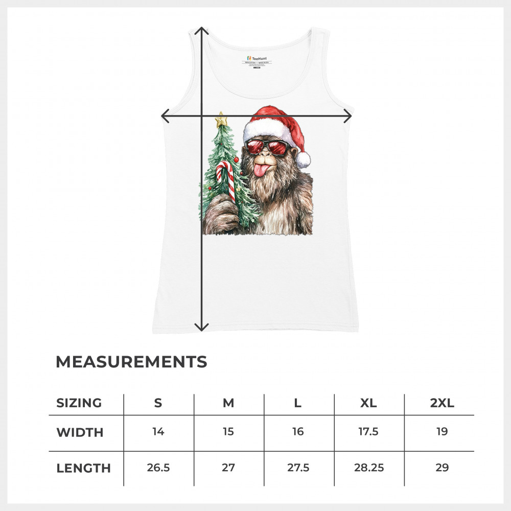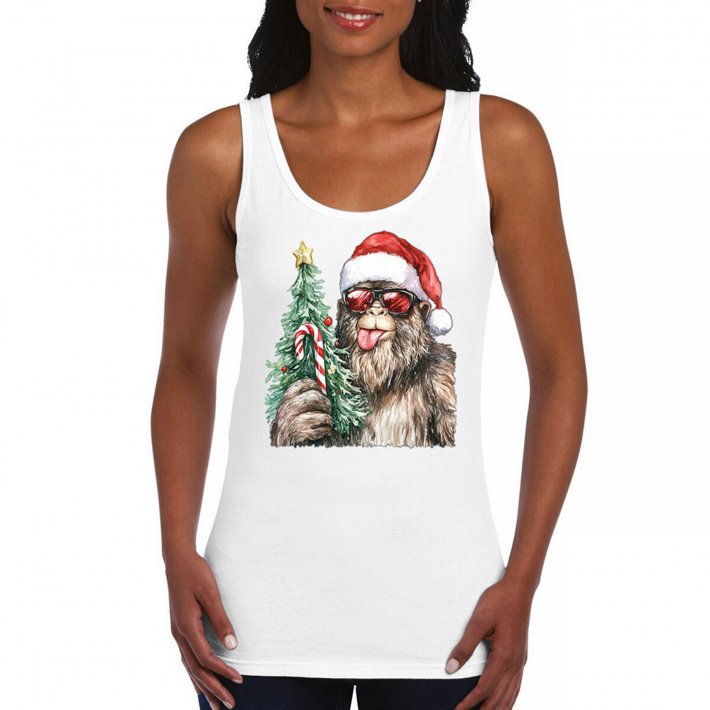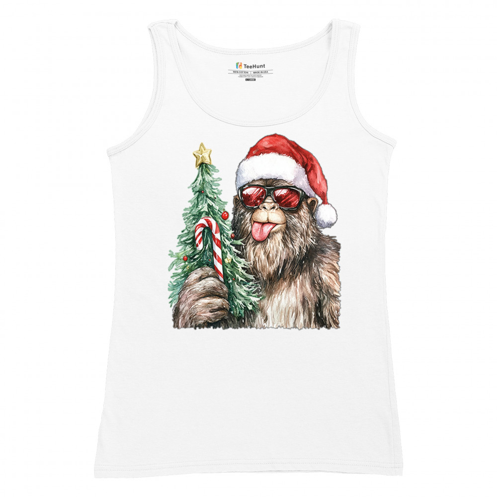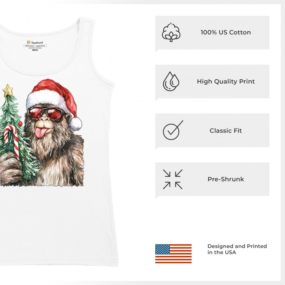 Bigfoot Christmas Santa shirt – festive Sasquatch holiday humor tee with Santa hat design, Xmas tree, candy cane, and funny Christmas style.