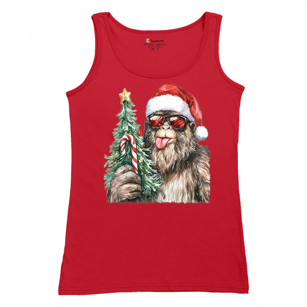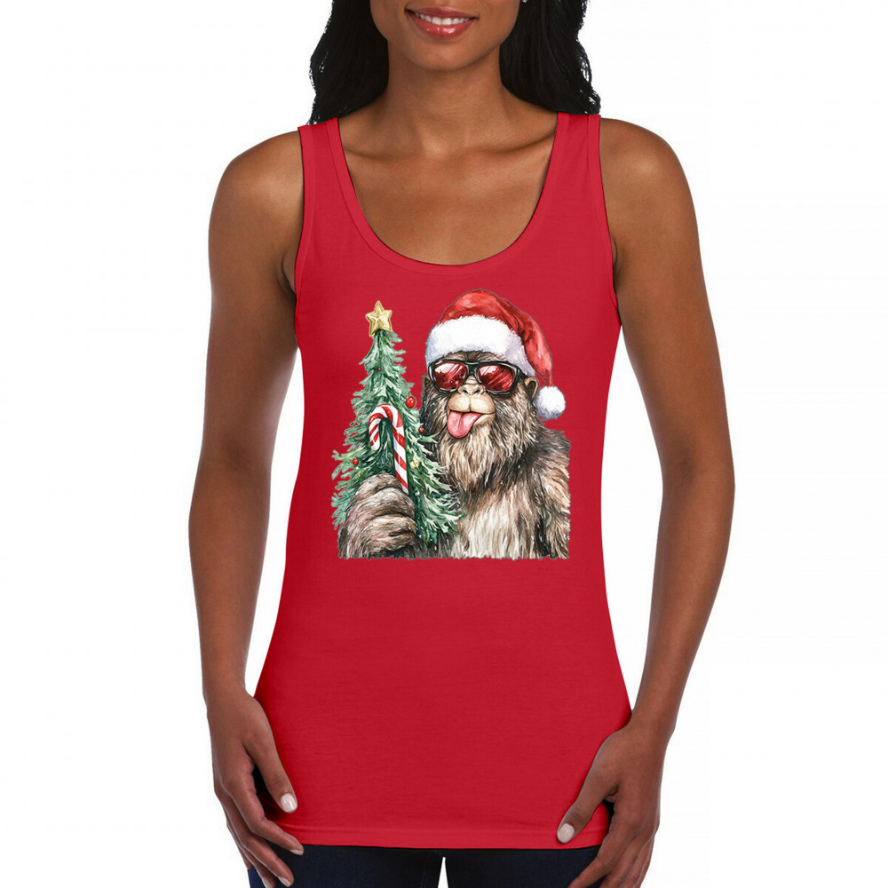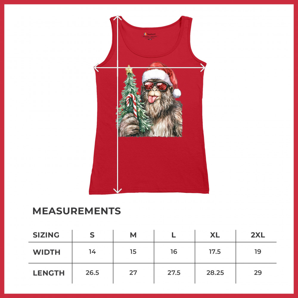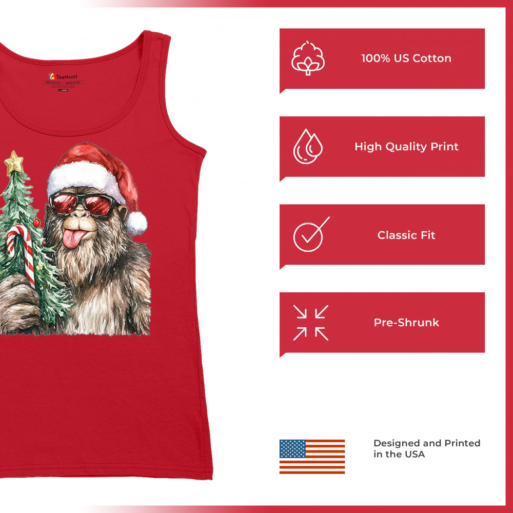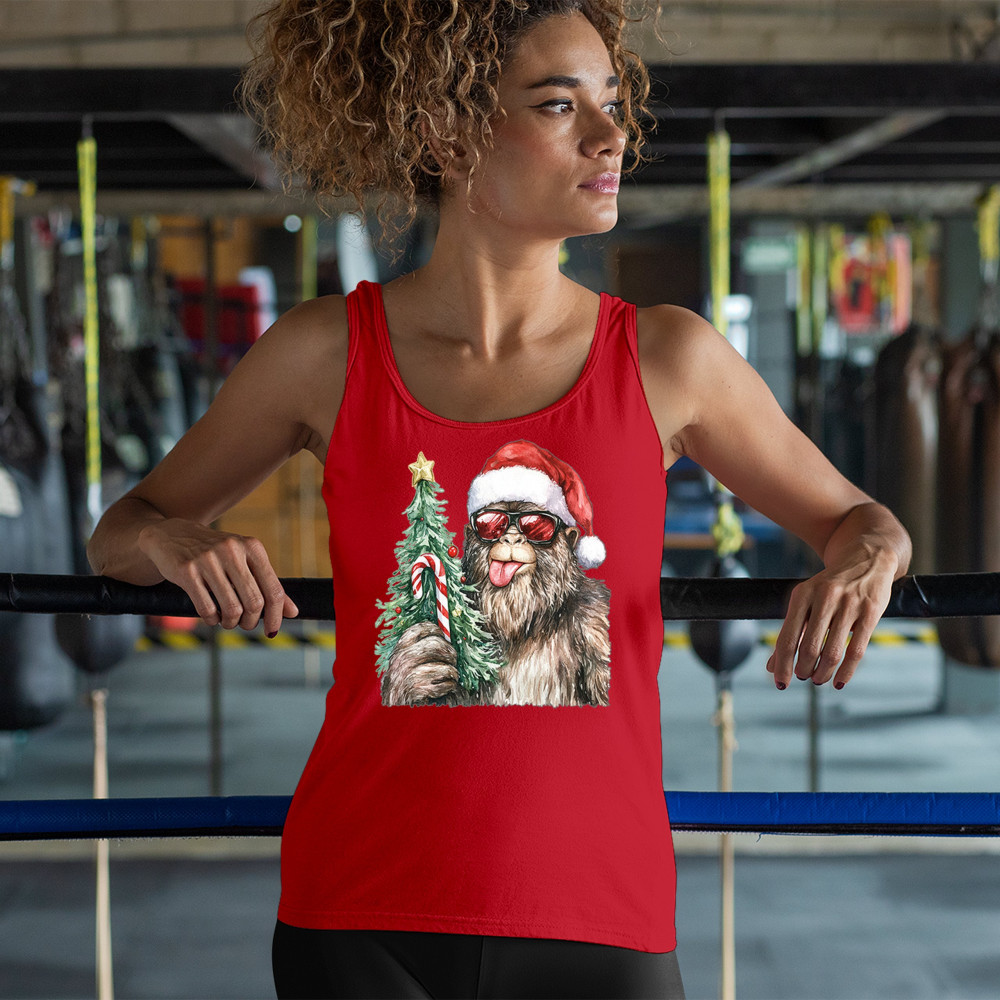 Bigfoot Christmas Santa shirt – festive Sasquatch holiday humor tee with Santa hat design, Xmas tree, candy cane, and funny Christmas style.