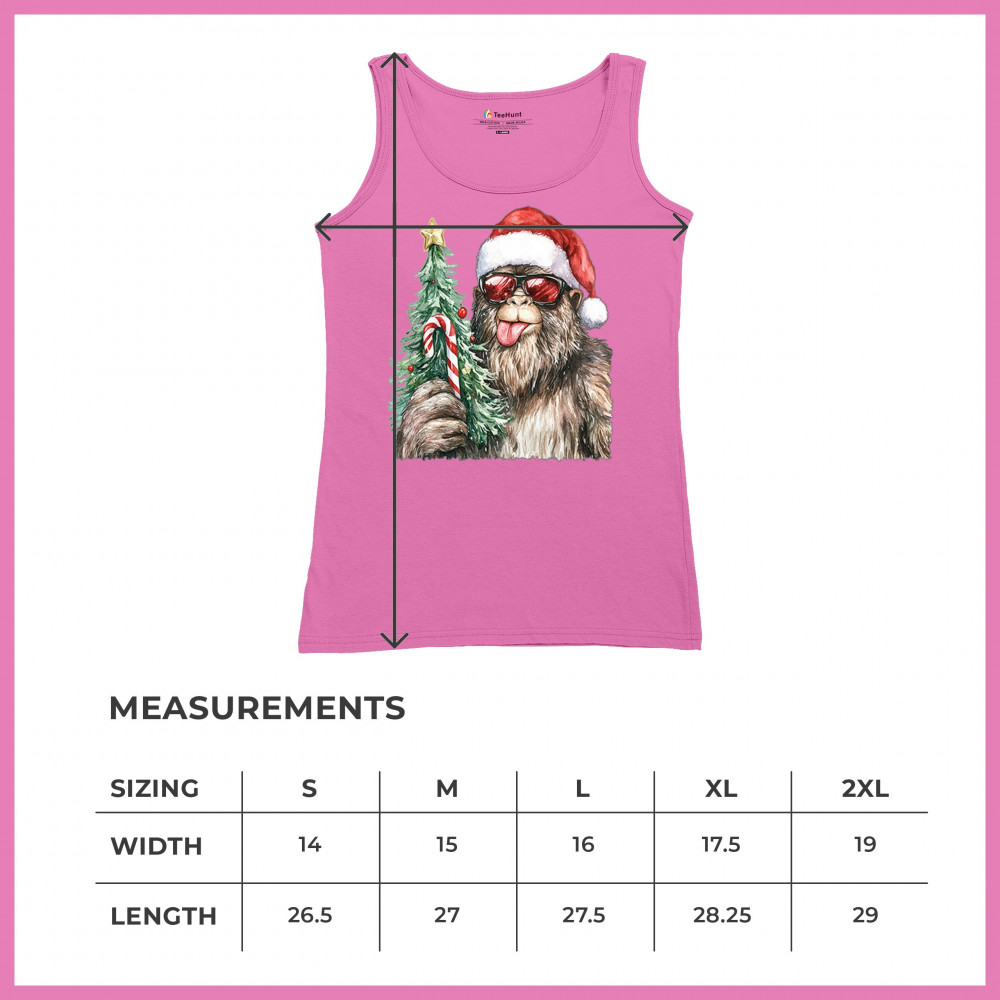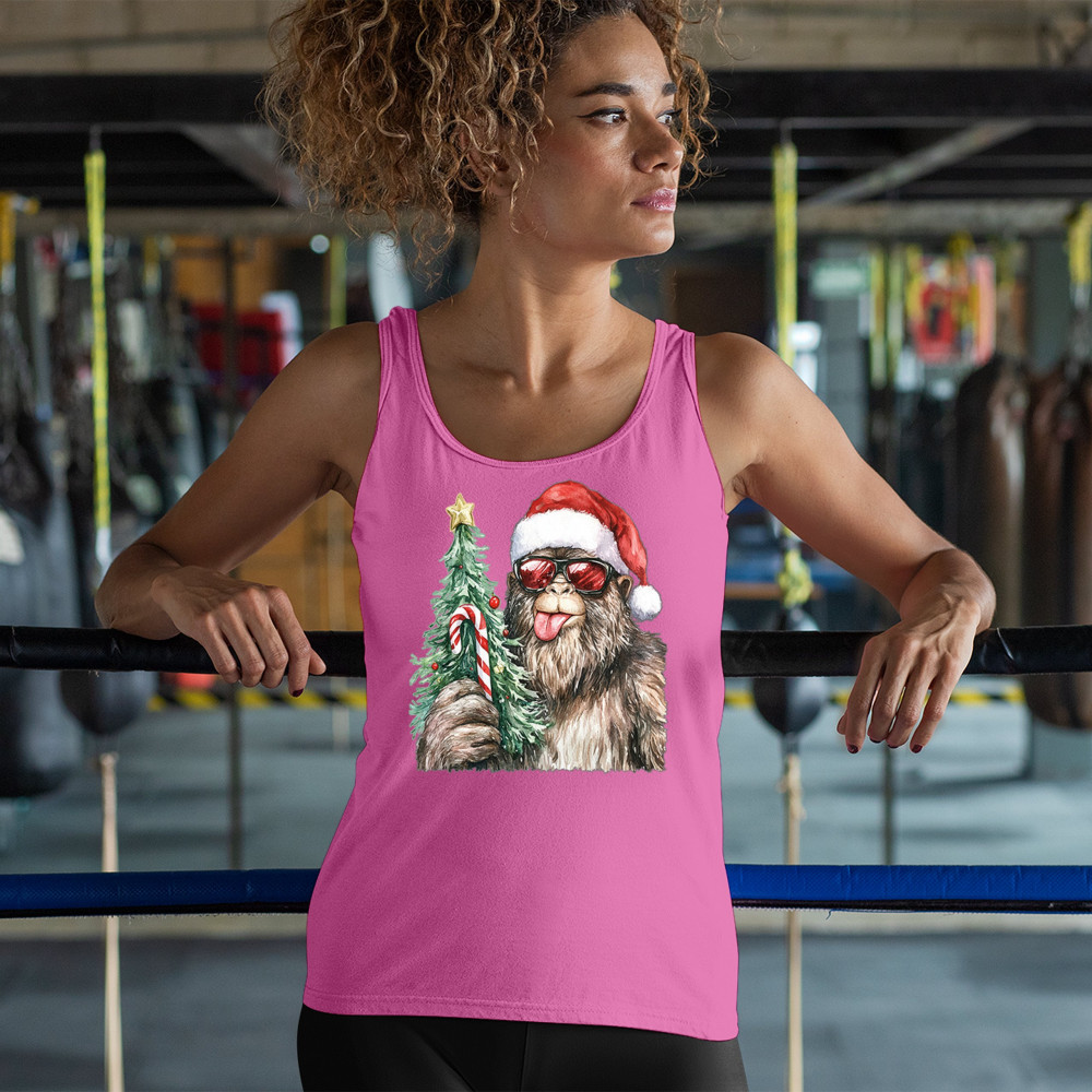 Bigfoot Christmas Santa shirt – festive Sasquatch holiday humor tee with Santa hat design, Xmas tree, candy cane, and funny Christmas style.