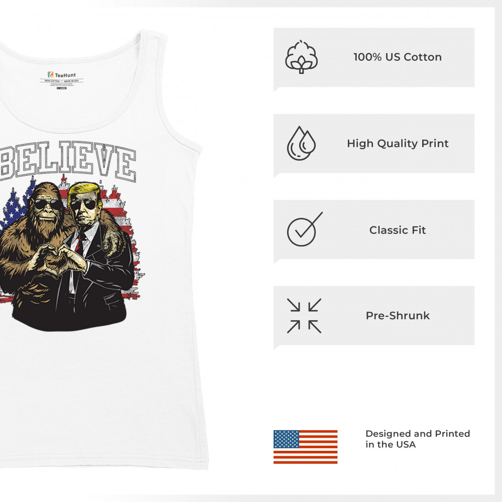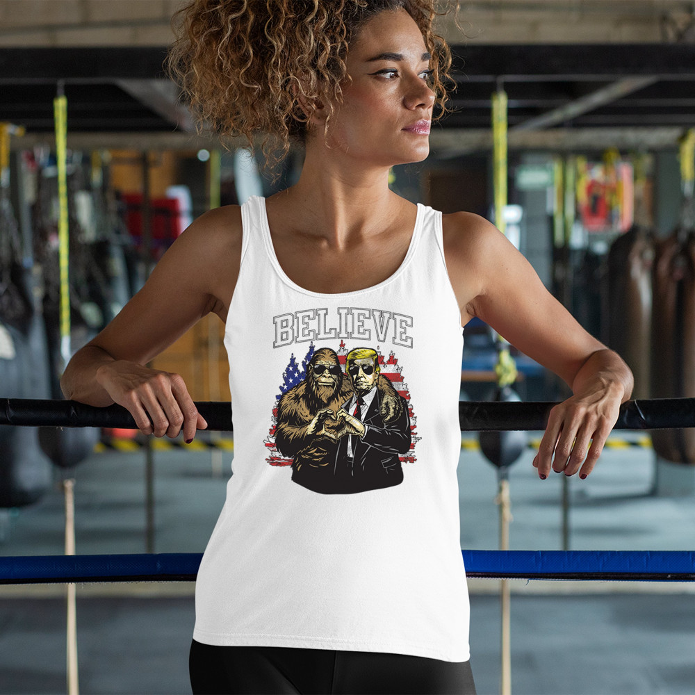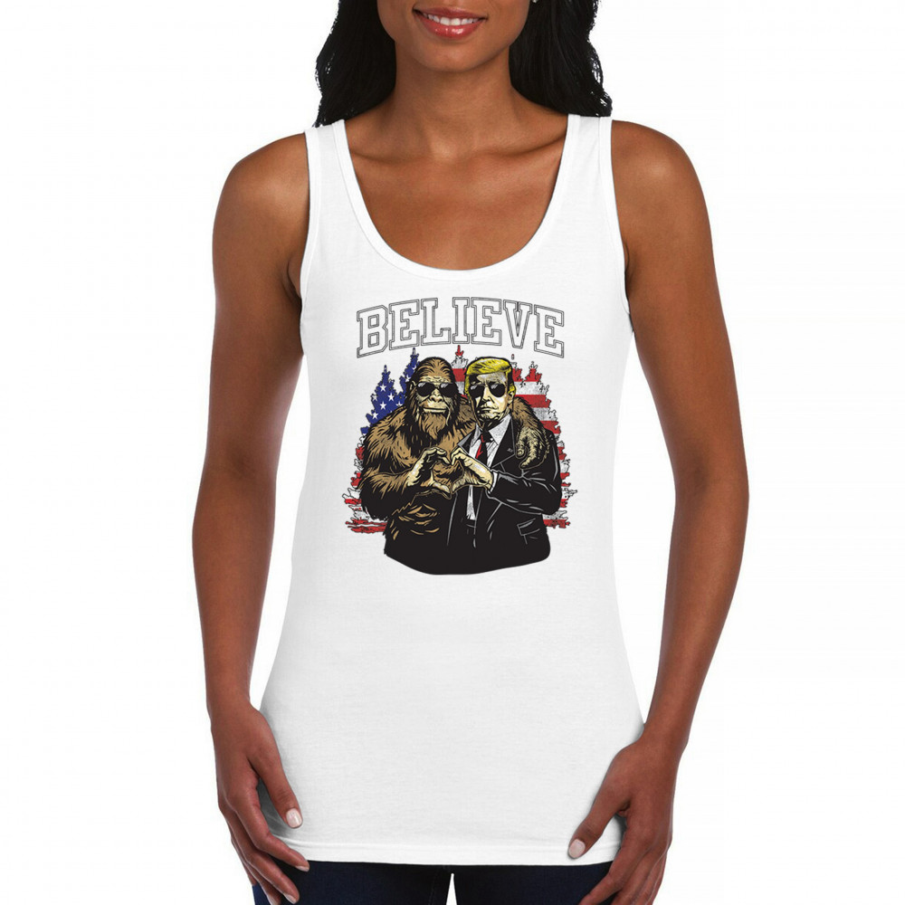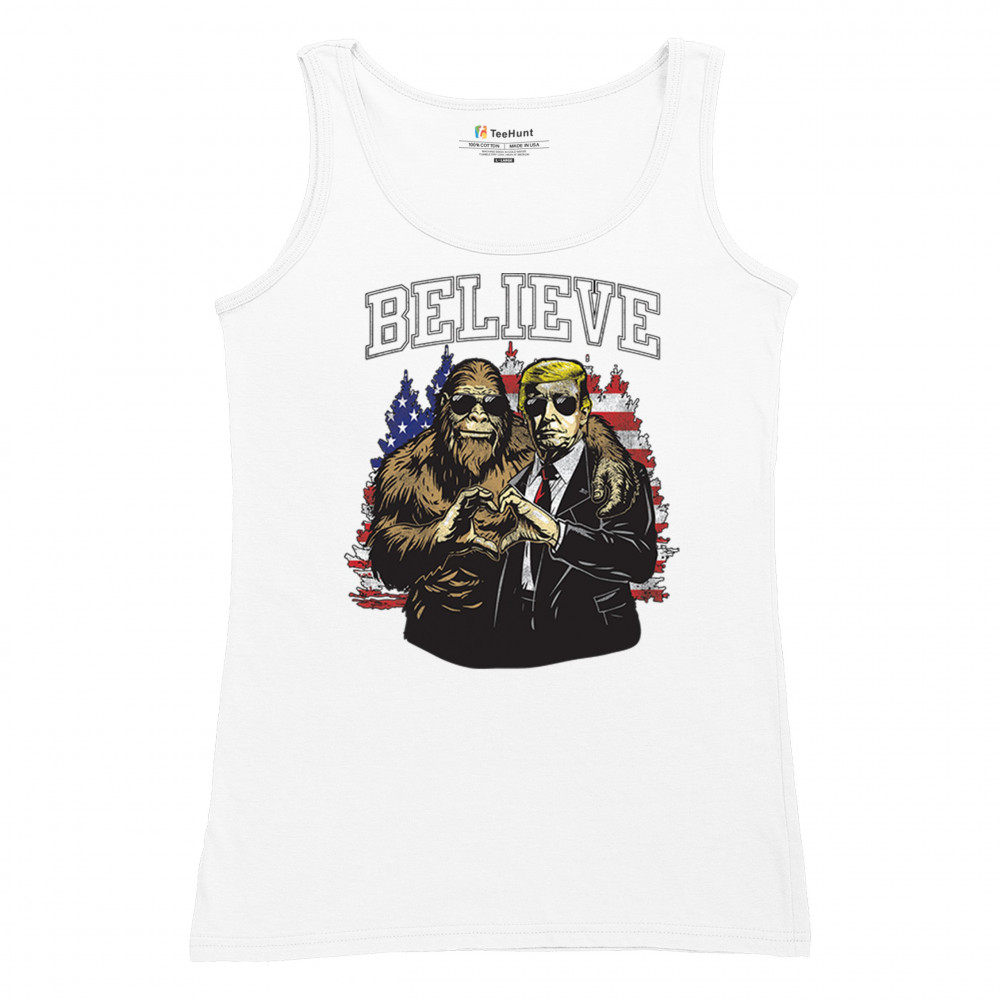 The "Believe" design combines patriotic pride and conservative values with a touch of fun. Featuring Donald J. Trump and a loyal Bigfoot against the American flag, this graphic is perfect for Trump supporters, Republicans, and believers in America First. Celebrate the Red Wave, the 47th President, and the unstoppable fight for victory. Ideal for anyone with unwavering belief in the people's mandate.