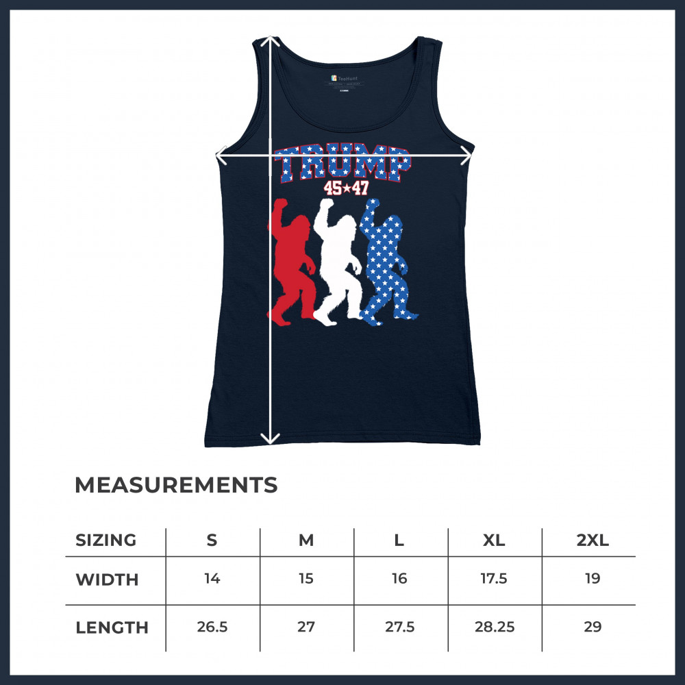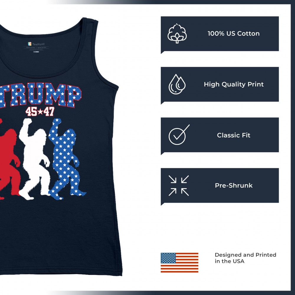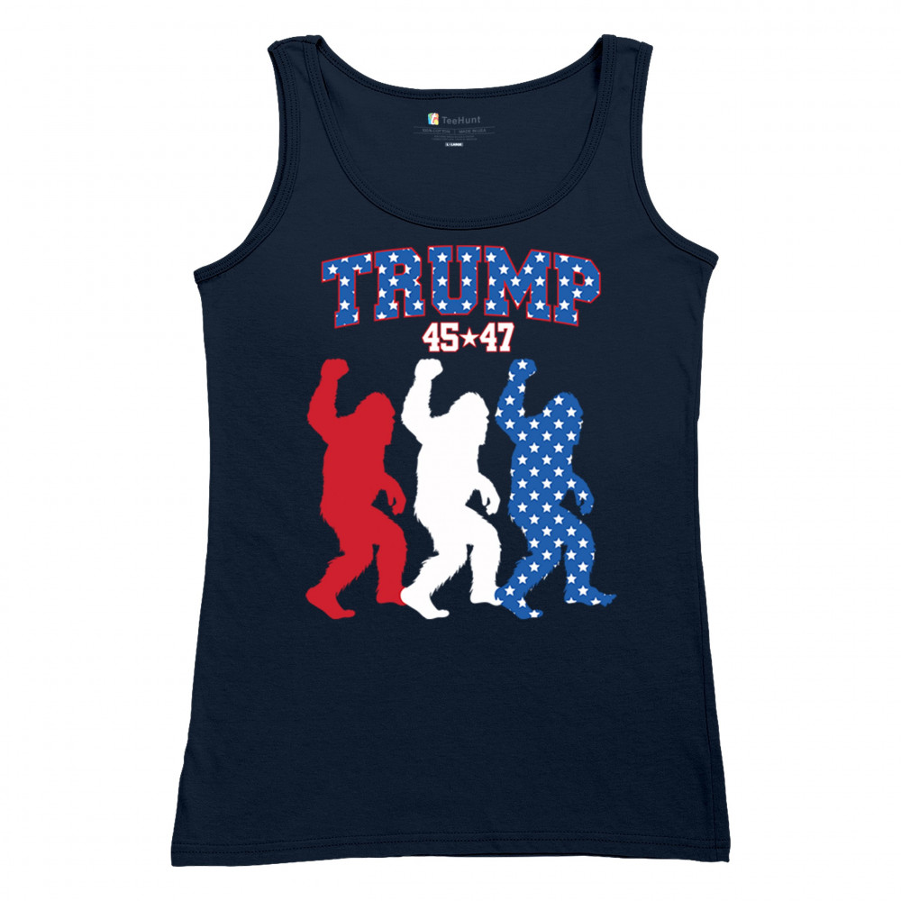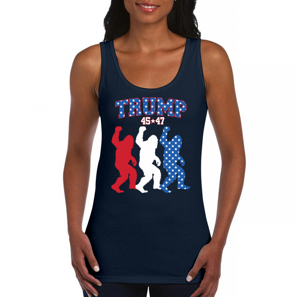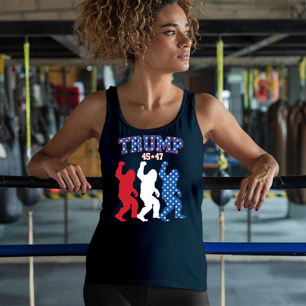Trump 45/47 Bigfoot design in red, white, and blue with American flag stars. Celebrate patriotism, humor, and the fight for America First values.