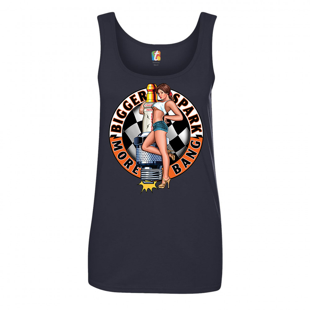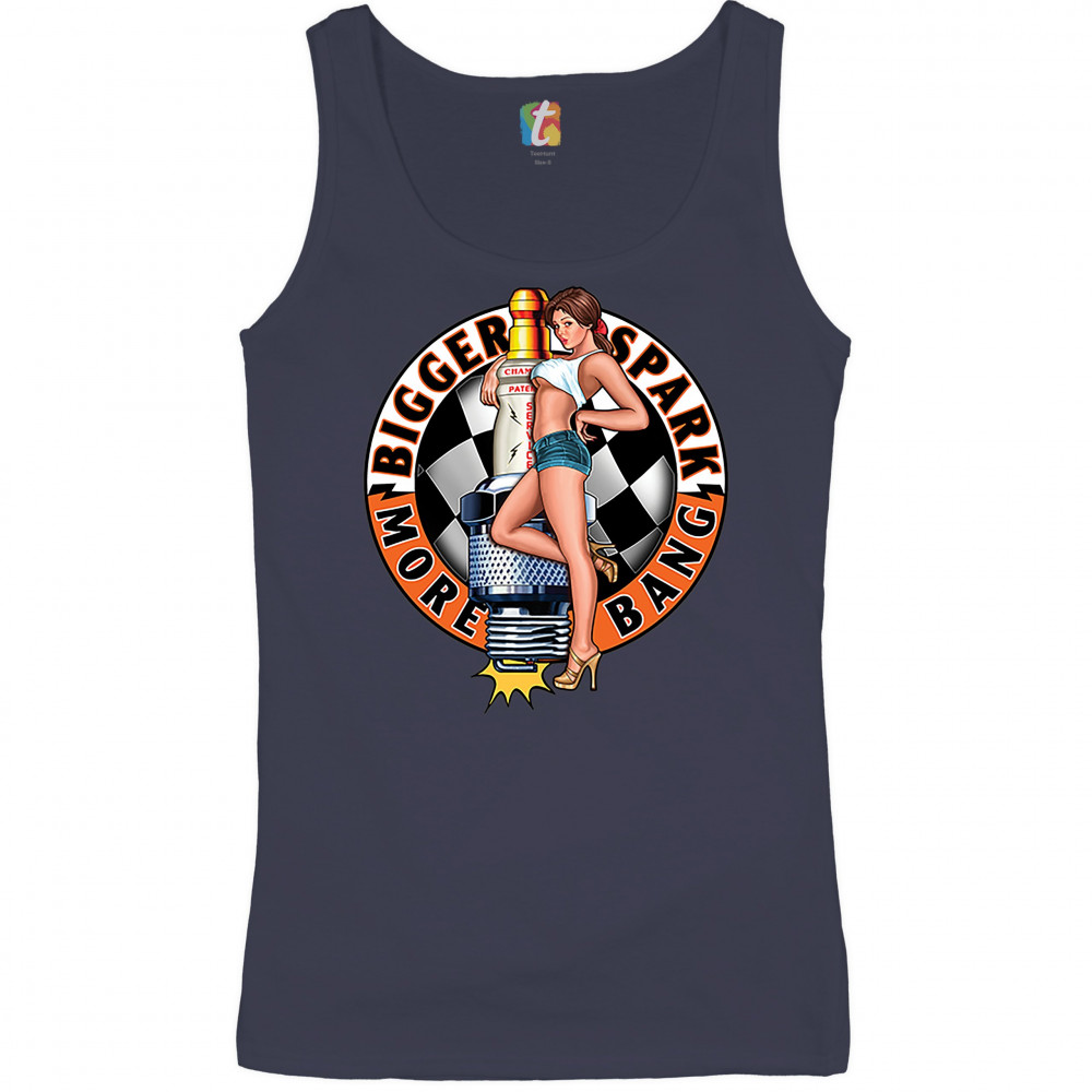BIGGER SPARK MORE BANG women's tank top pin-up girl vintage automotive navy blue