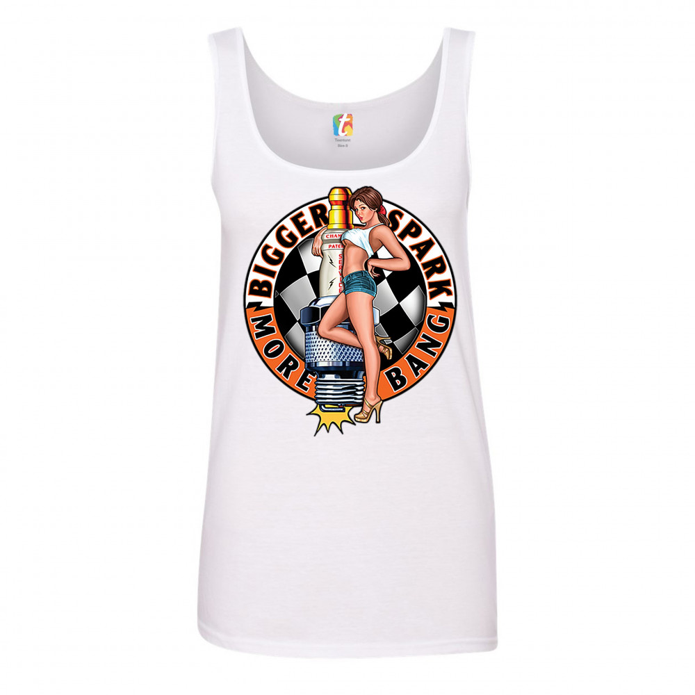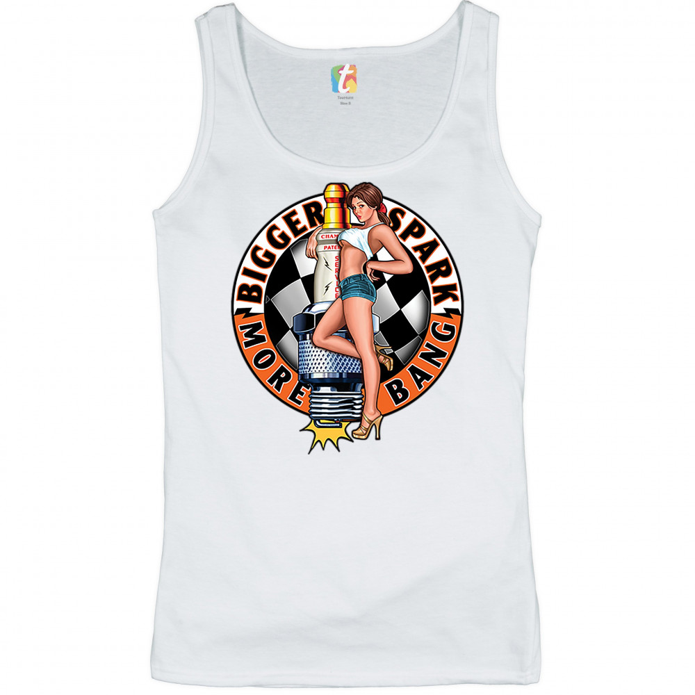 BIGGER SPARK MORE BANG women's tank top pin-up girl vintage automotive white