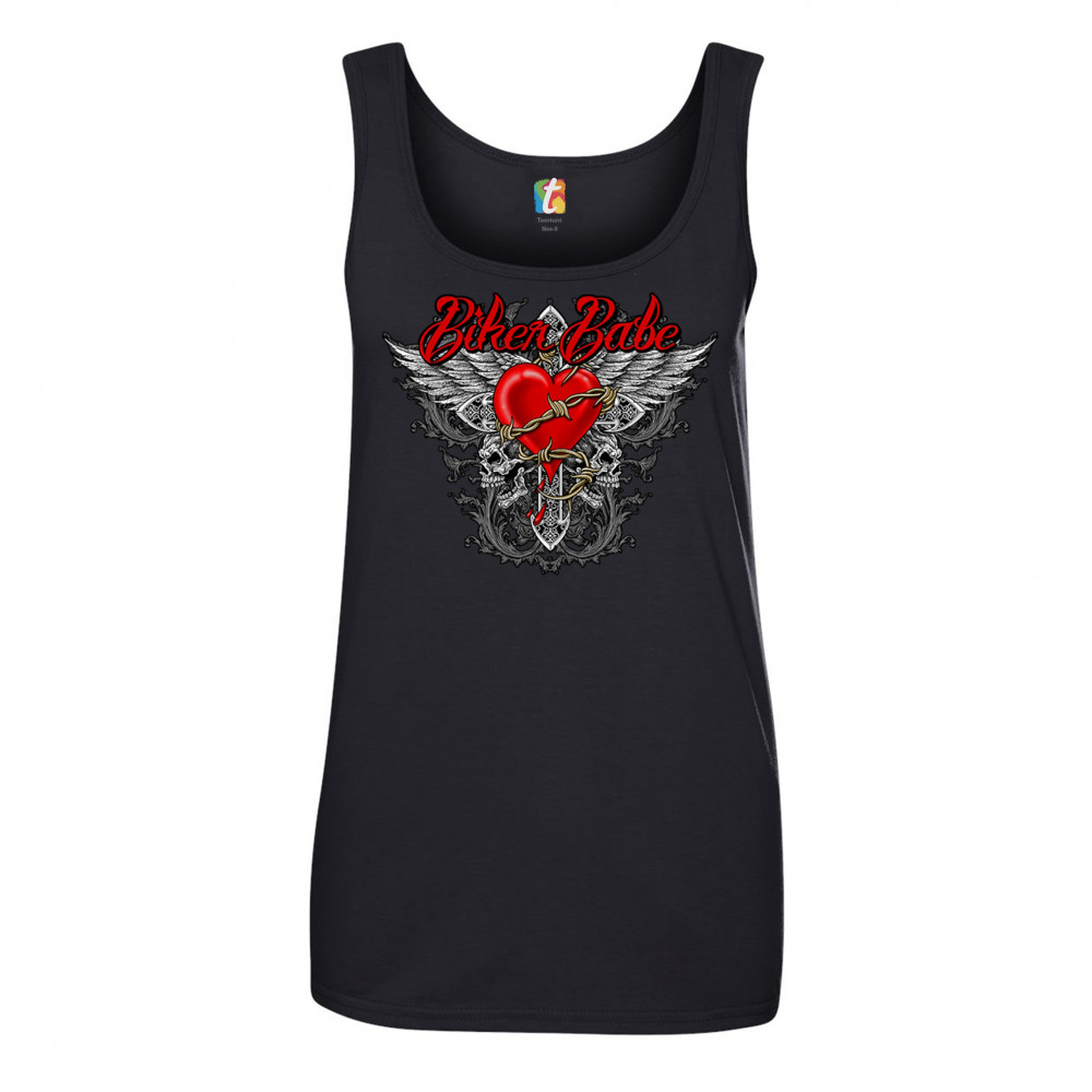 A print saying: "biker babe" and featuring a cross, wings, two skulls and a bleeding heart, all tied together by barbed wire. A great choice for a motorcycle enthusiast.