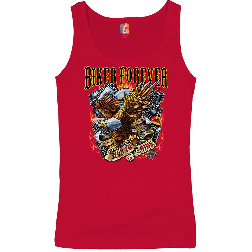 A print featuring an American bald eagle, holding a stripe with "live to ride" written on it, a v-engine in the background, a pair of dice and playing cards. At the top the print says: "biker forever". A great choice for a motorcycle enthusiast.