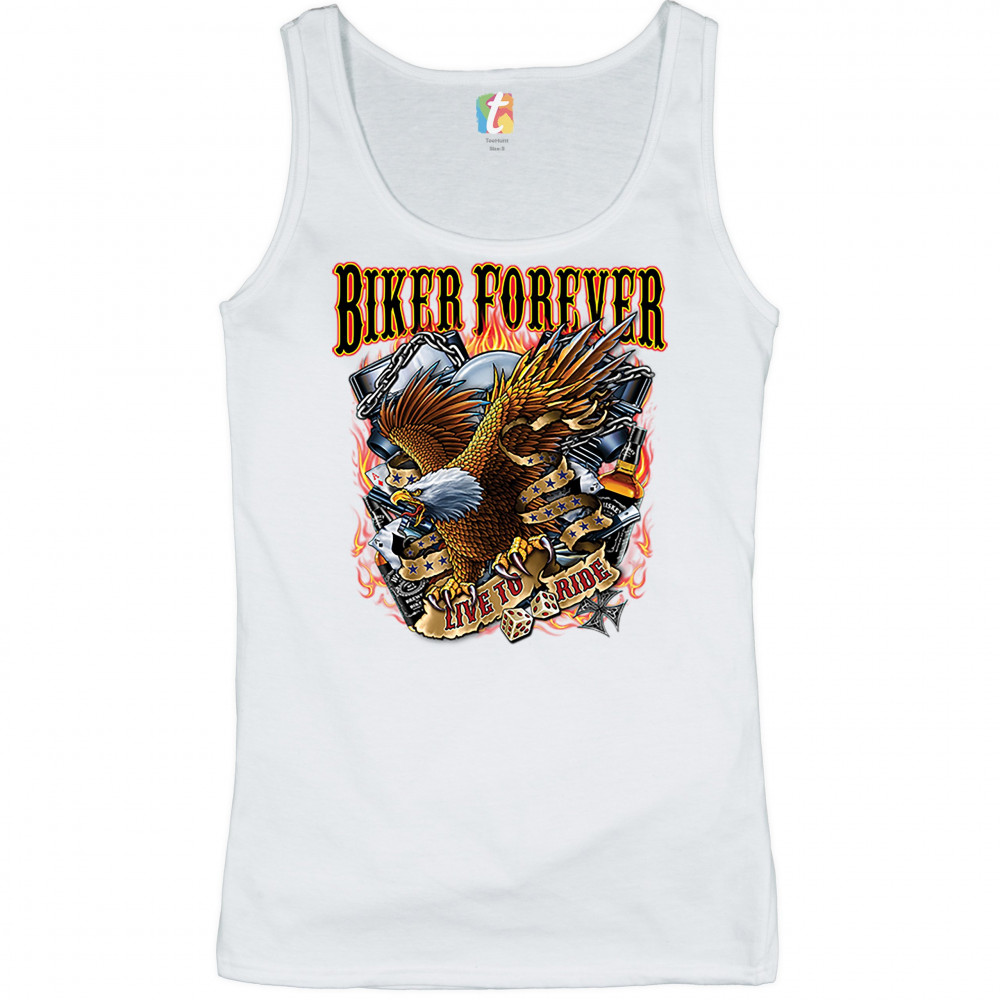 A print featuring an American bald eagle, holding a stripe with "live to ride" written on it, a v-engine in the background, a pair of dice and playing cards. At the top the print says: "biker forever". A great choice for a motorcycle enthusiast.
