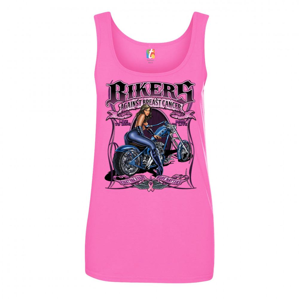 A print featuring a badass biker chick leaning on a chopper. The print says: "Bikers against breast cancer. Live to ride. Ride to live." At the bottom of the print there are two stripes with "fight for a cure, hope matters" written on them. Between the st