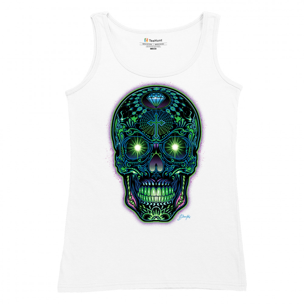 This electrified sugar skull design glows with neon energy and intricate details. Featuring green eyes, radiant cross, diamond, spider web, and vivid colors, it's a bold mash-up of psychedelic art, Day of the Dead tradition, and rave culture. A vibrant design perfect for skull fans and spiritual rebels alike.