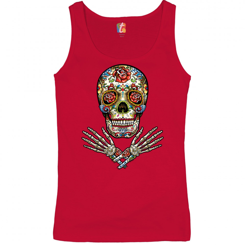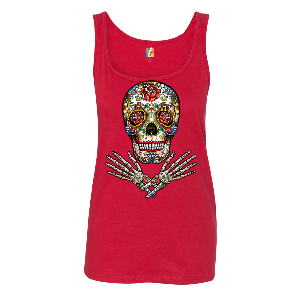 A huge print featuring a big calavera with roses in the eye sockets. There is a cross between the eyes and a huge rose on the forehead. Below the skull there are crossed arms. A great choice for anyone who upholds the traditions and celebrates the Day of