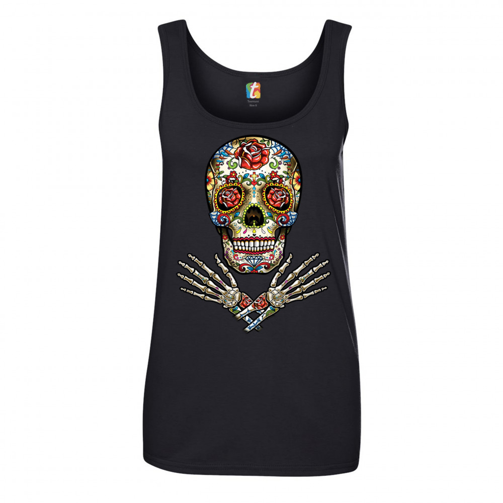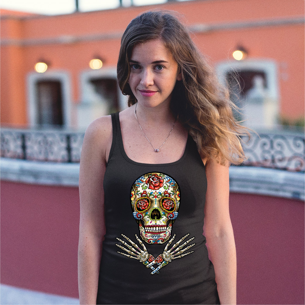 A huge print featuring a big calavera with roses in the eye sockets. There is a cross between the eyes and a huge rose on the forehead. Below the skull there are crossed arms. A great choice for anyone who upholds the traditions and celebrates the Day of