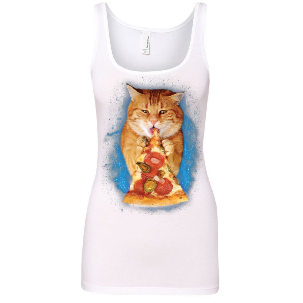 CAT EATING PIZZA women's tank top funny weird kitten pet kitty peperoni top white