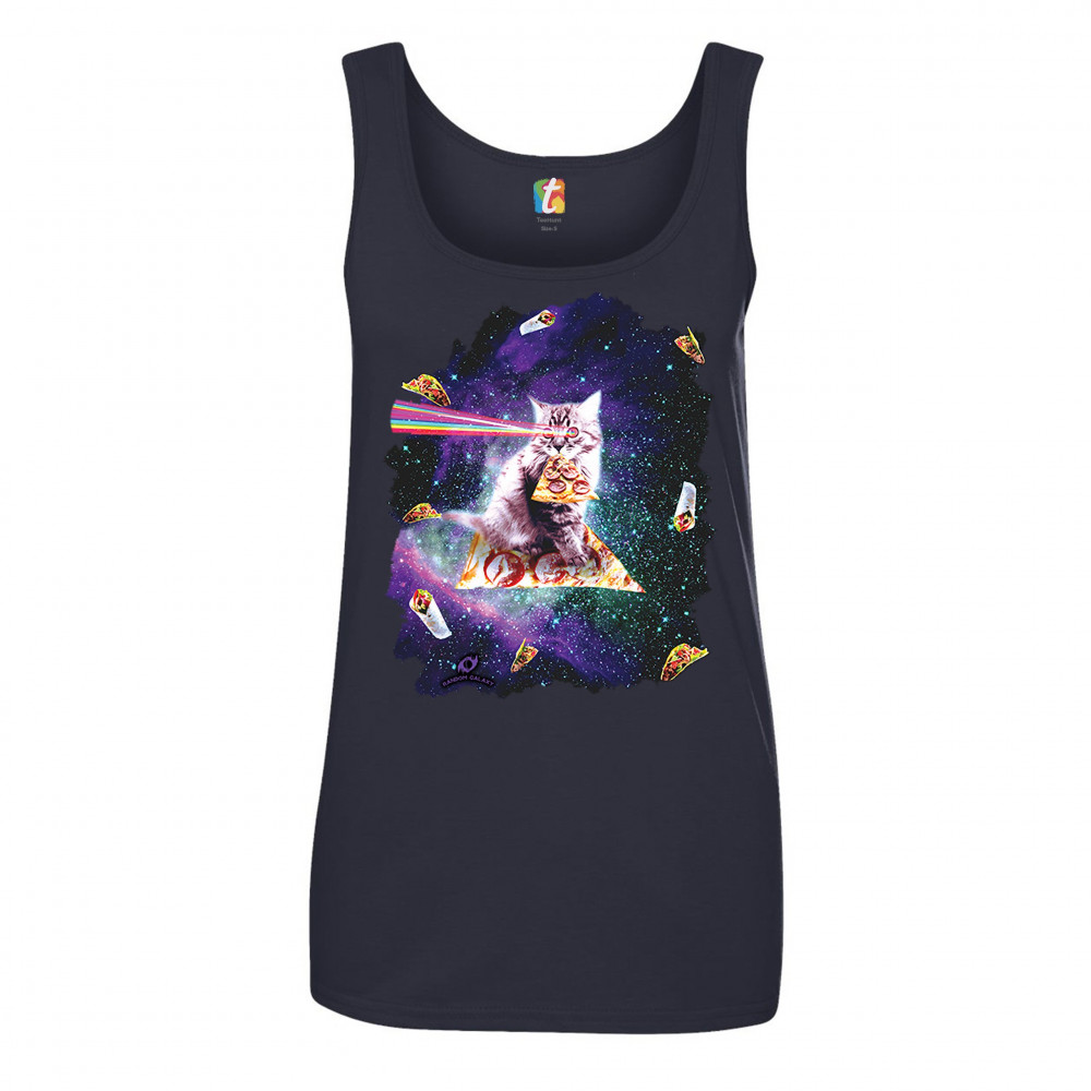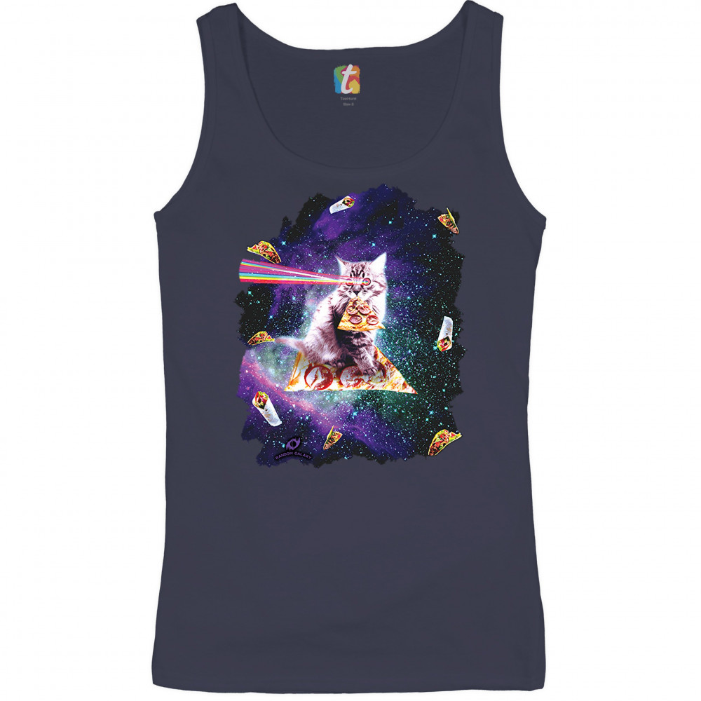 CAT FIRING RAINBOW LASER RIDING PIZZA SLICE IN SPACE women's tank top weird navy blue