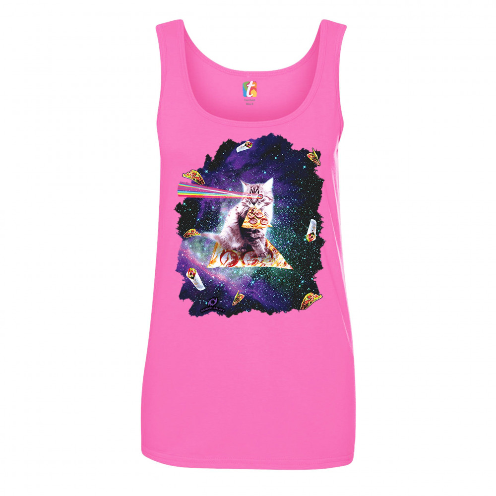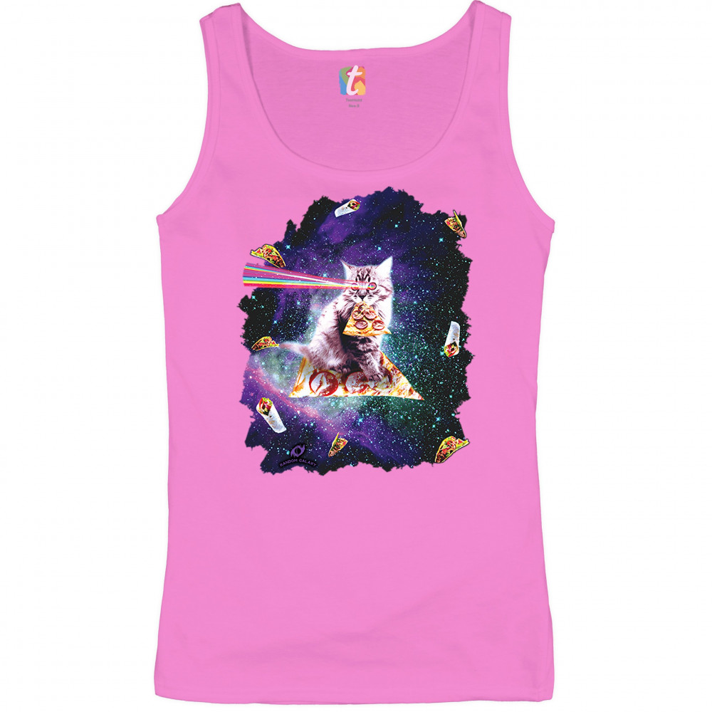 A print featuring a cat flying through space on a slice of pizza holding another slice in it's mouth while firing rainbow lasers from it's eyes. The cat is surrounded by burritos and shawarmas. A great choice for anyone who is into cats, space and weird s