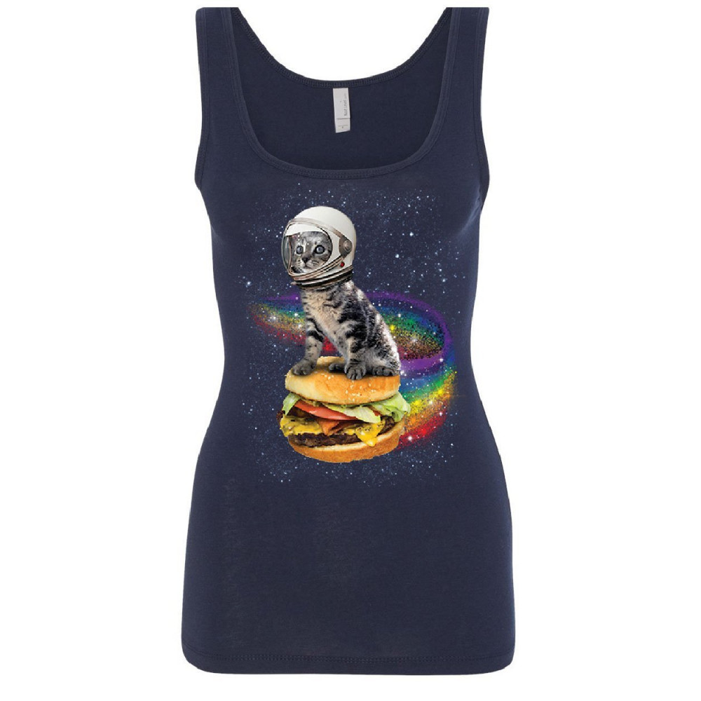 CAT FLYING A RAINBOW BURGER women's tank top funny astronaut kitten space top navy blue