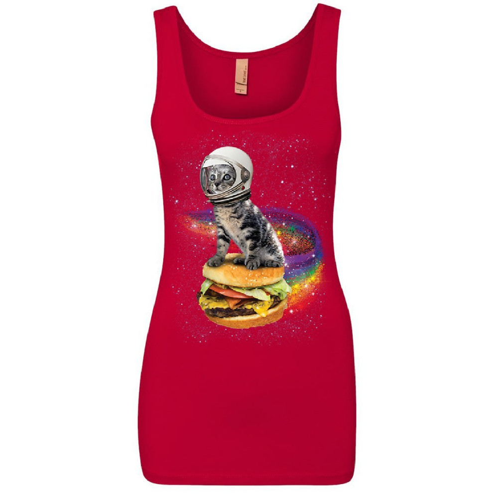 CAT FLYING A RAINBOW BURGER women's tank top funny astronaut kitten space top red