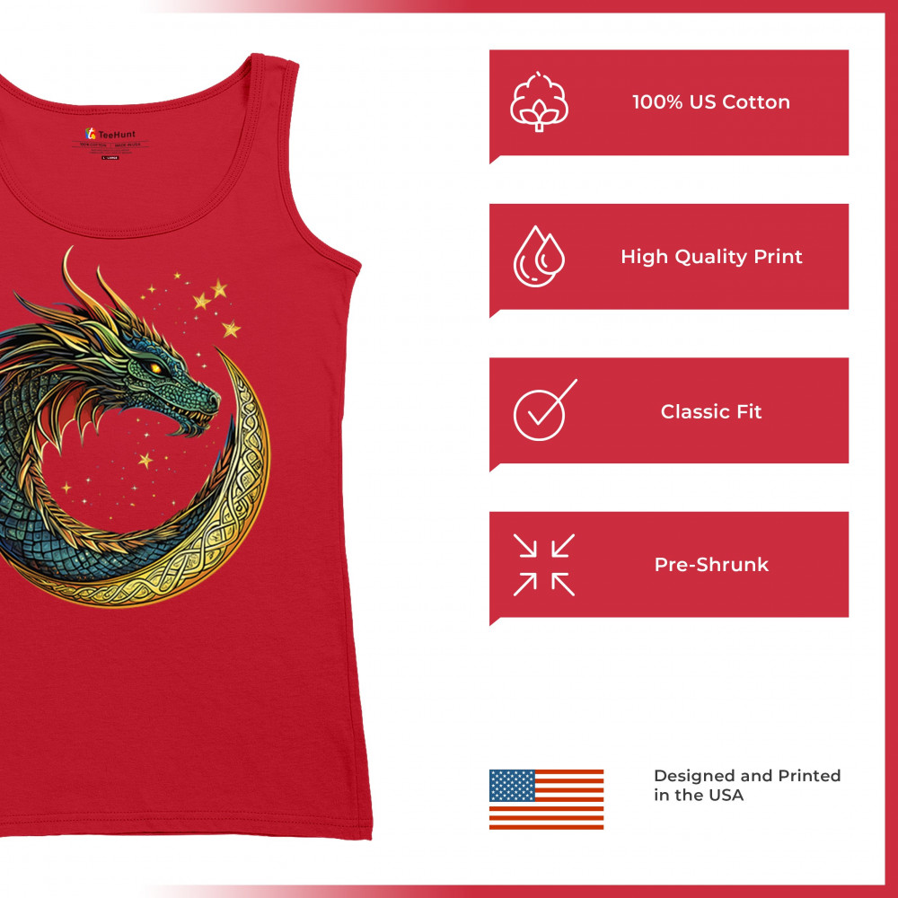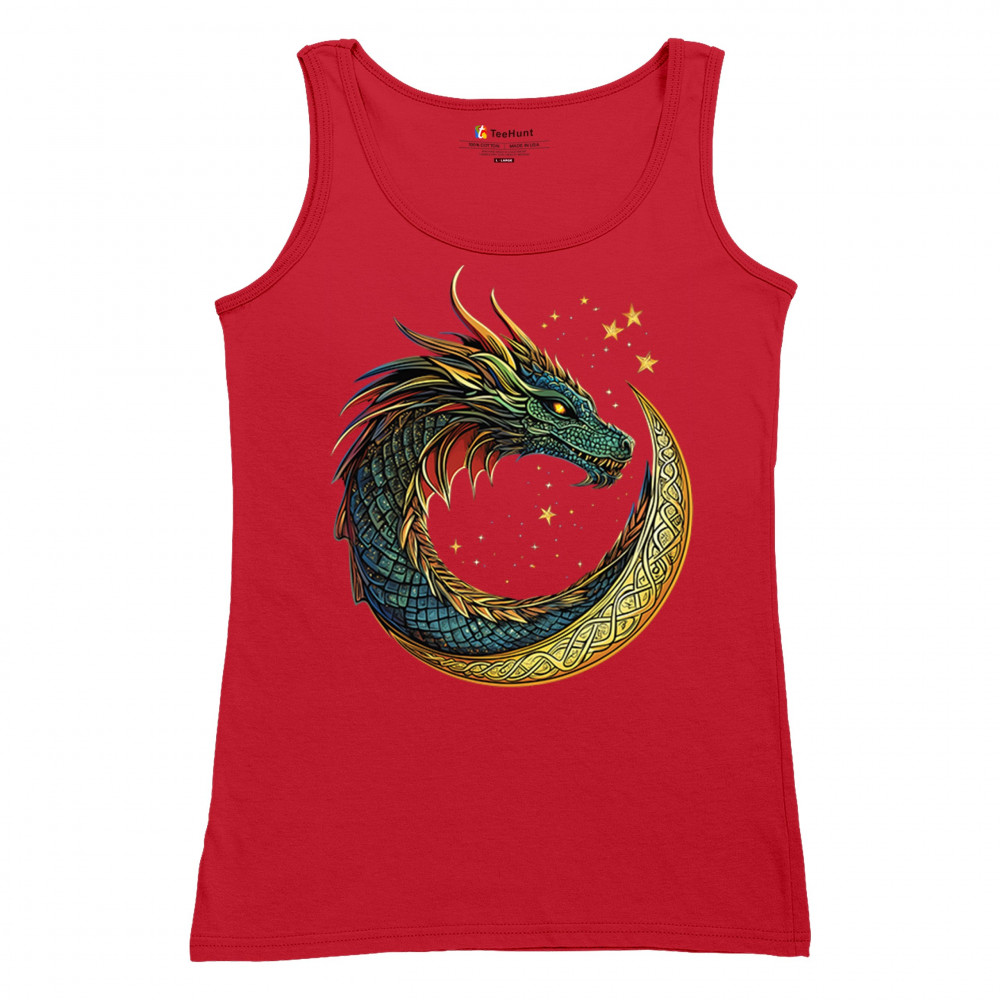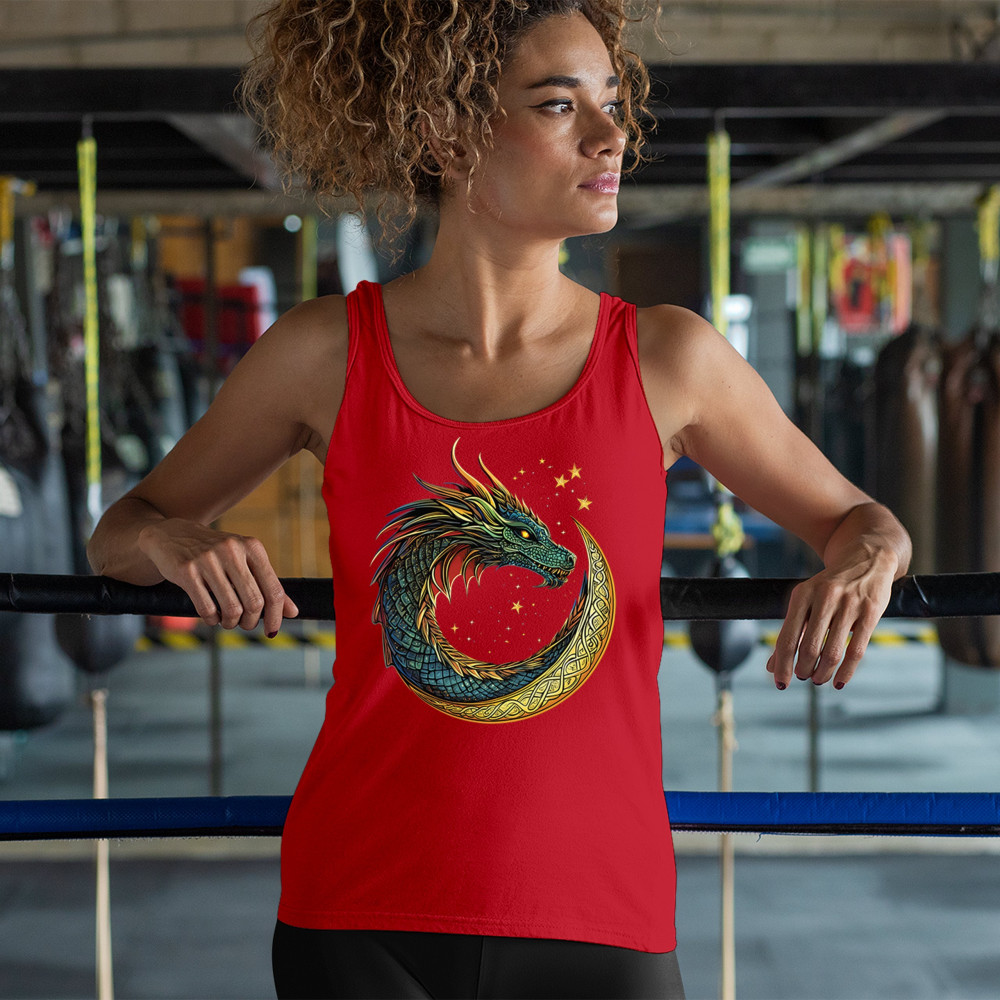 Fierce dragon in Celtic crescent moon with glowing eyes and starry sky. Perfect for fantasy fans, gamers, and spiritual warriors seeking mythic art.