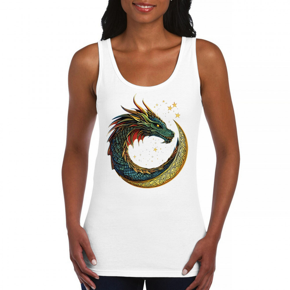 Fierce dragon in Celtic crescent moon with glowing eyes and starry sky. Perfect for fantasy fans, gamers, and spiritual warriors seeking mythic art.