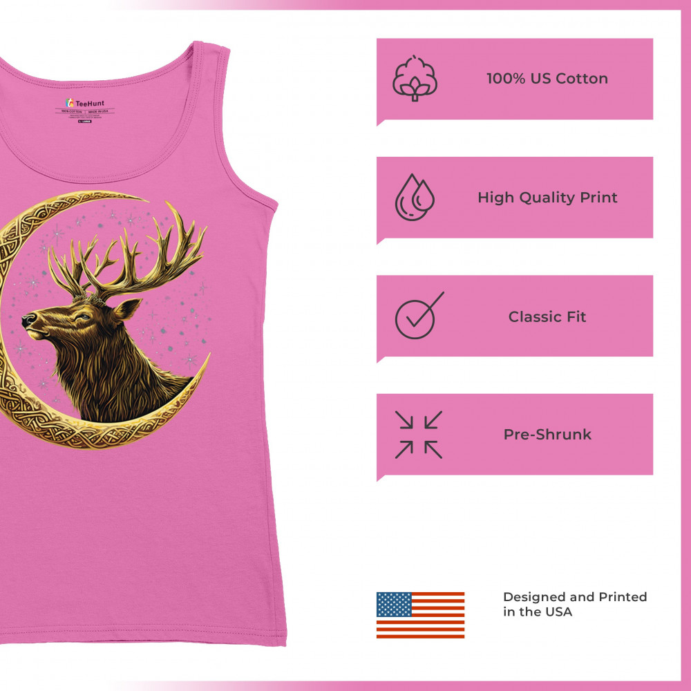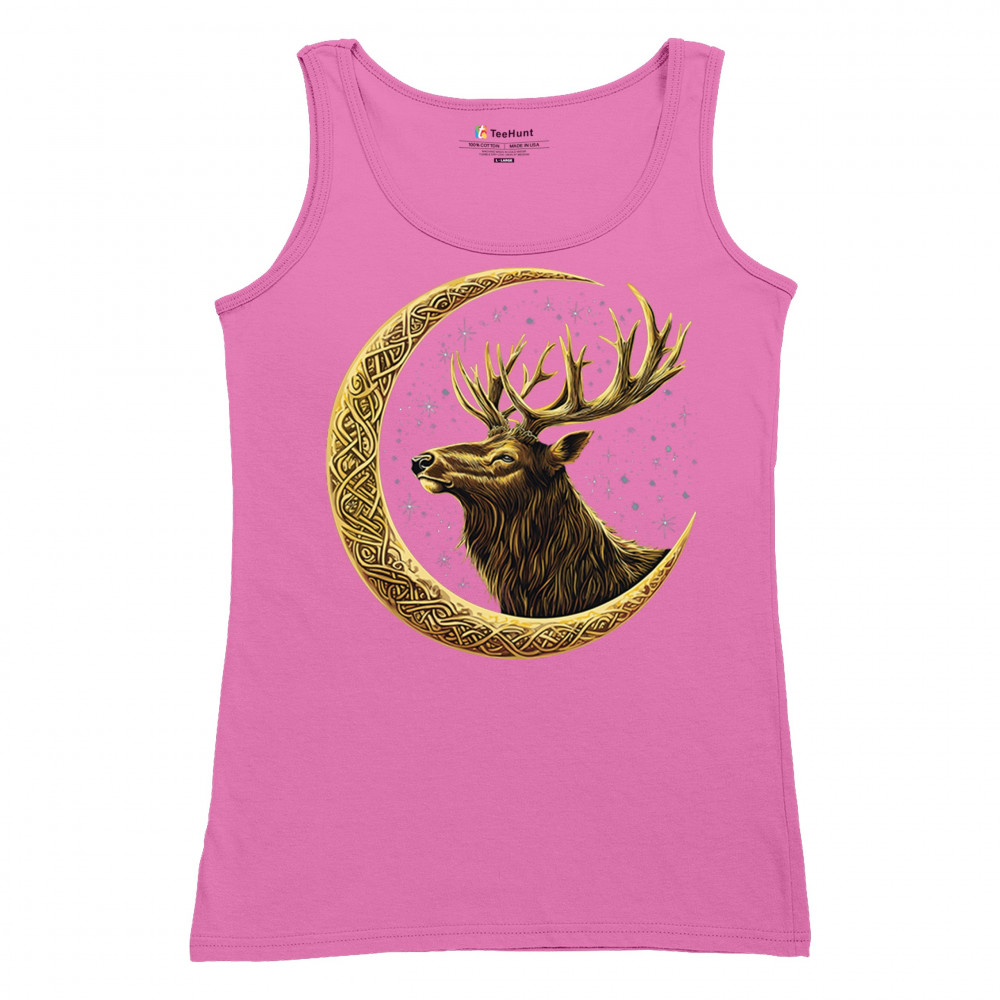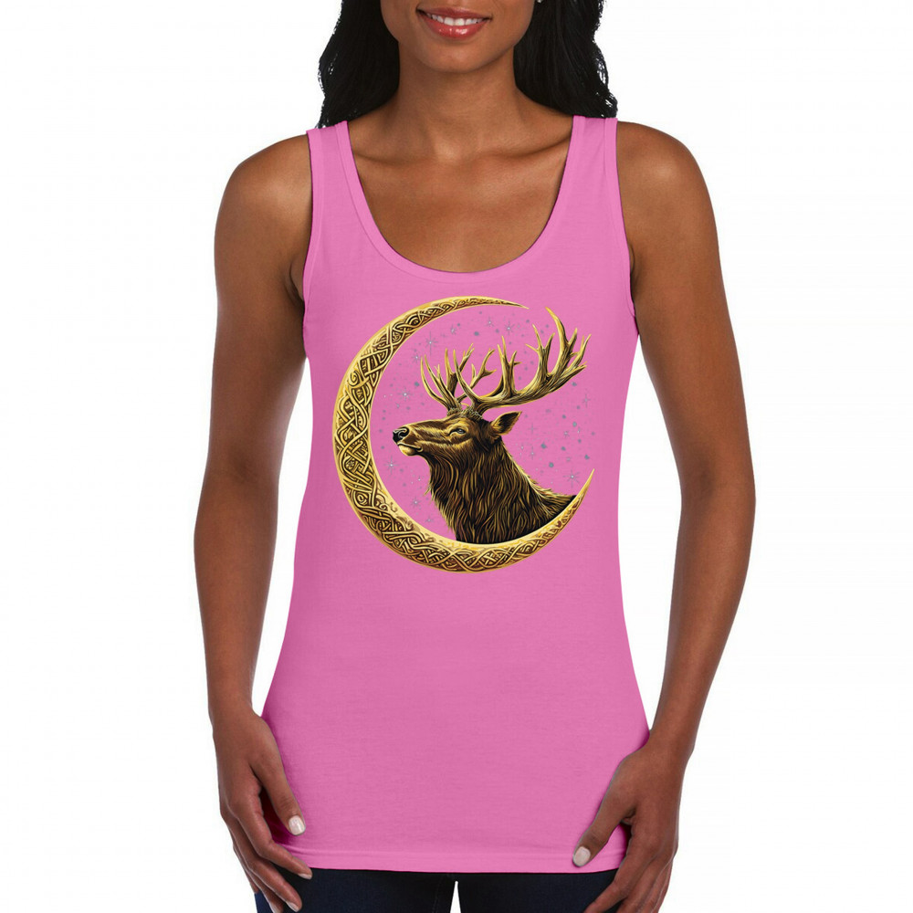 Celtic stag design with golden moon and cosmic stars. Symbolizes forest strength, leadership, and spiritual energy. Perfect for nature lovers.