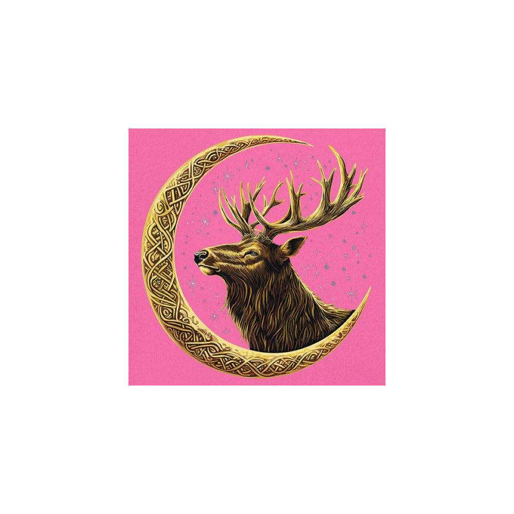 A majestic stag with bold antlers is framed by a glowing golden Celtic moon, set against a mystical night sky. This powerful image symbolizes strength, leadership, and spiritual connection to the forest. Perfect for fantasy fans, spiritual seekers, hunters, or anyone who honors nature, tribal themes, and cosmic symbolism.
