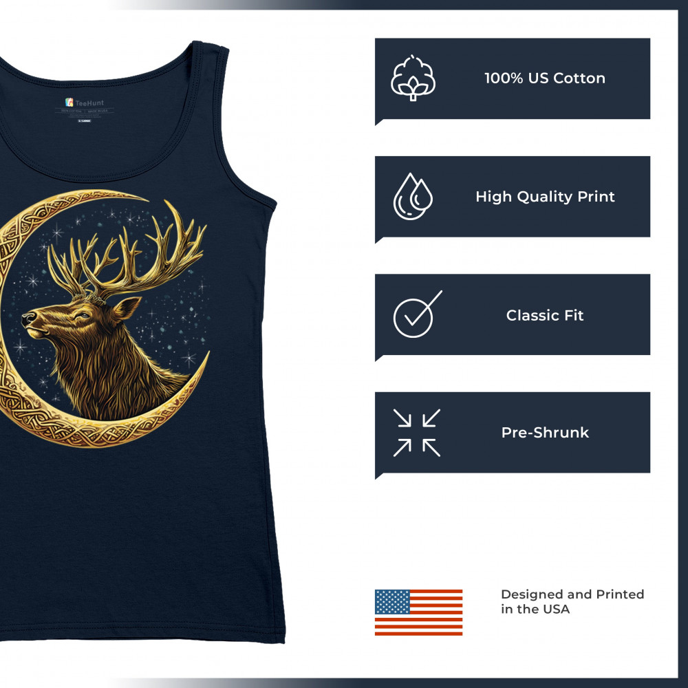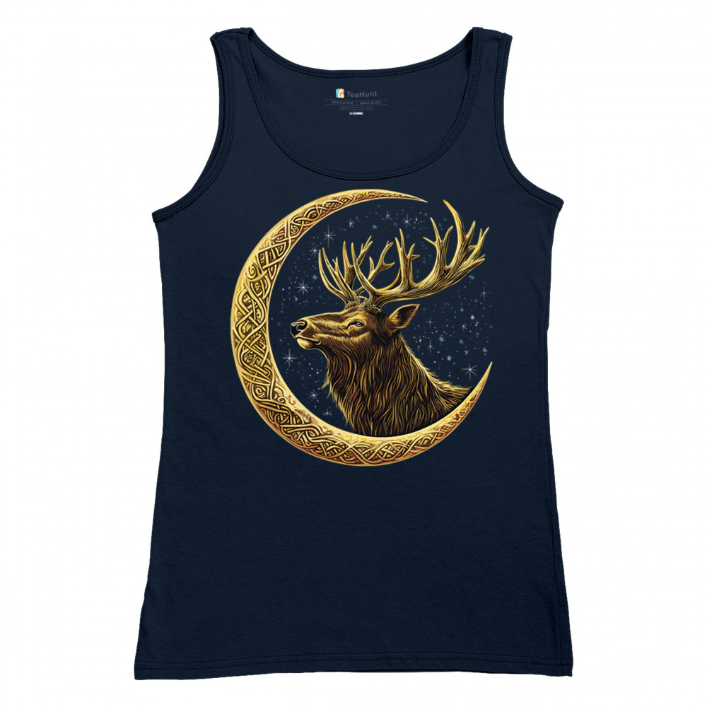 Celtic stag design with golden moon and cosmic stars. Symbolizes forest strength, leadership, and spiritual energy. Perfect for nature lovers.