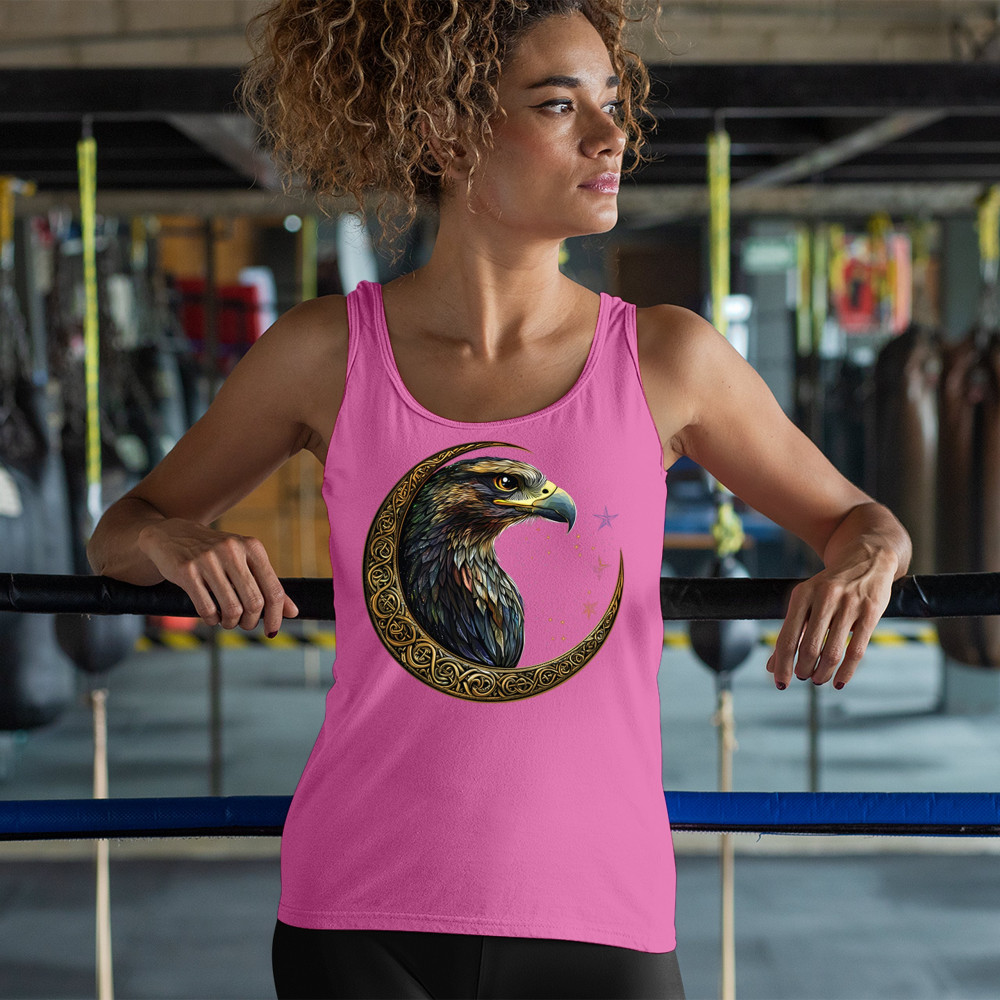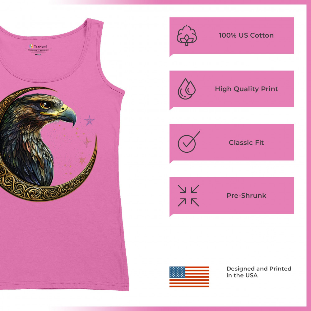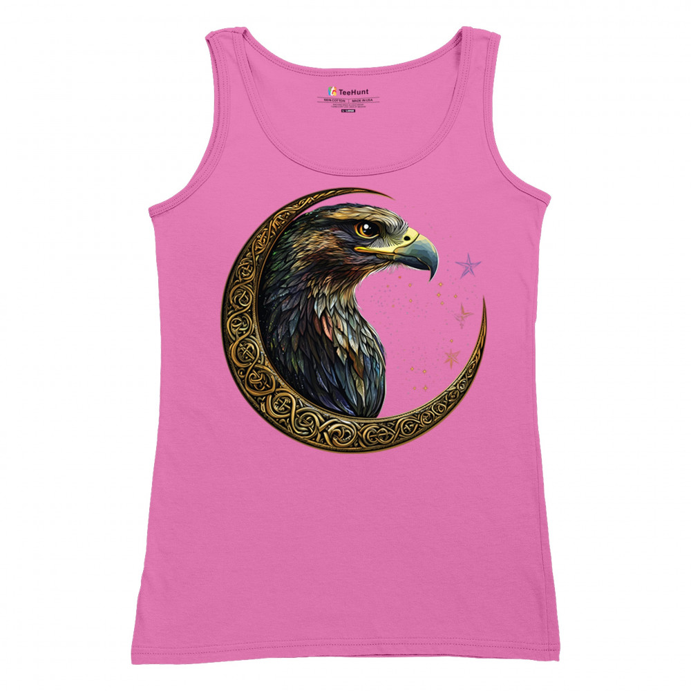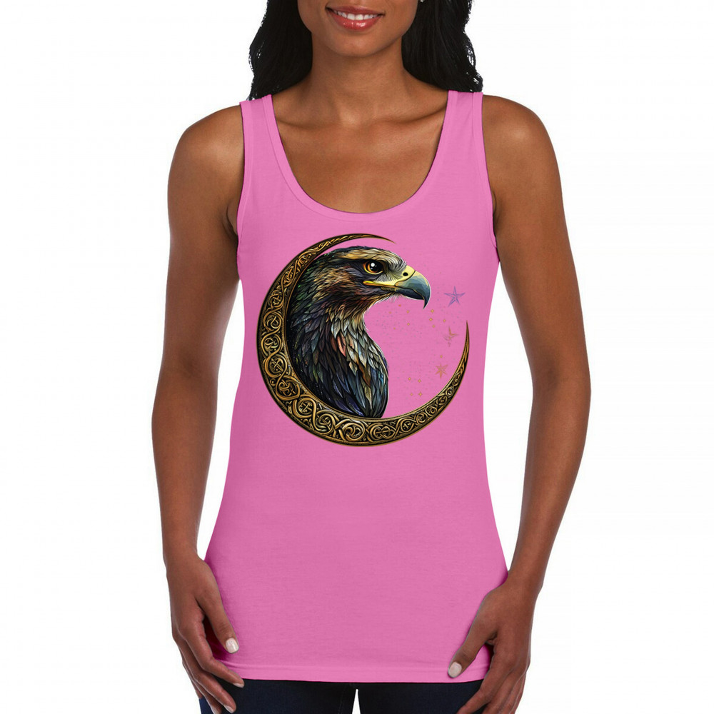 A beautifully detailed eagle with vibrant feathers is framed by a golden Celtic crescent moon and surrounded by a starry cosmic sky. This striking design represents freedom, spiritual power, and the mystery of the skies. Perfect for patriots, bird lovers, and those who connect with nature, tribal symbolism, and celestial art.