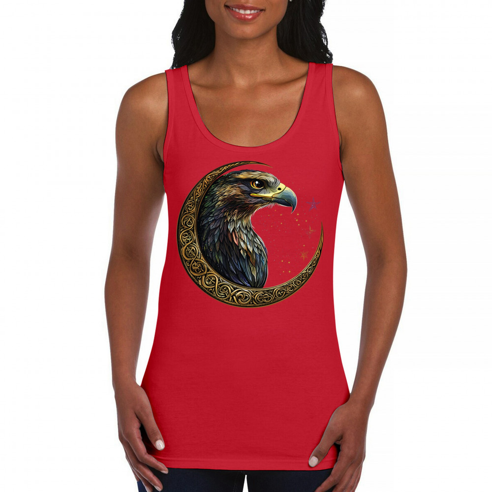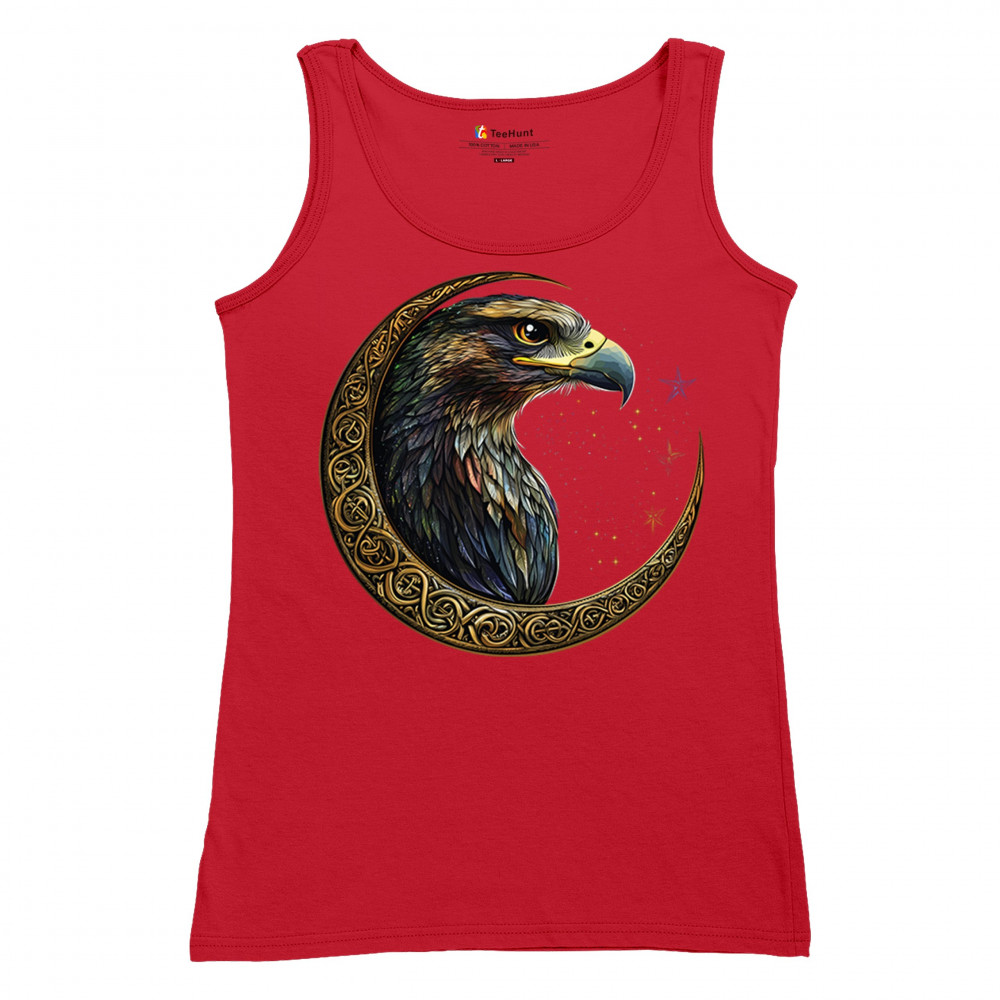 A beautifully detailed eagle with vibrant feathers is framed by a golden Celtic crescent moon and surrounded by a starry cosmic sky. This striking design represents freedom, spiritual power, and the mystery of the skies. Perfect for patriots, bird lovers, and those who connect with nature, tribal symbolism, and celestial art.
