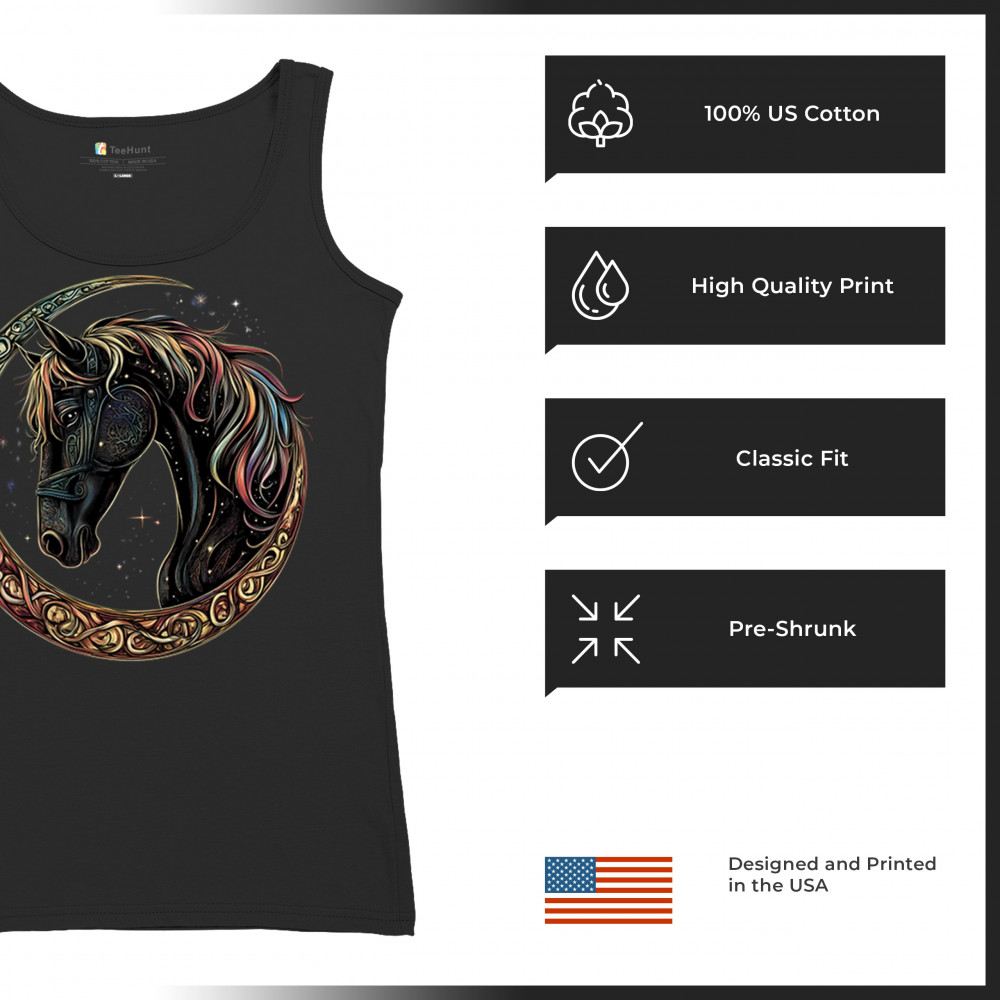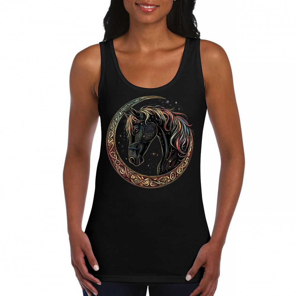 Celebrate the power and grace of the cosmos with this majestic black horse framed by a golden Celtic crescent moon. Its rainbow mane and celestial body symbolize strength, movement, mystery, and spiritual magic. A stunning piece for fantasy fans, equestrians, and dreamers who love horses and stars.